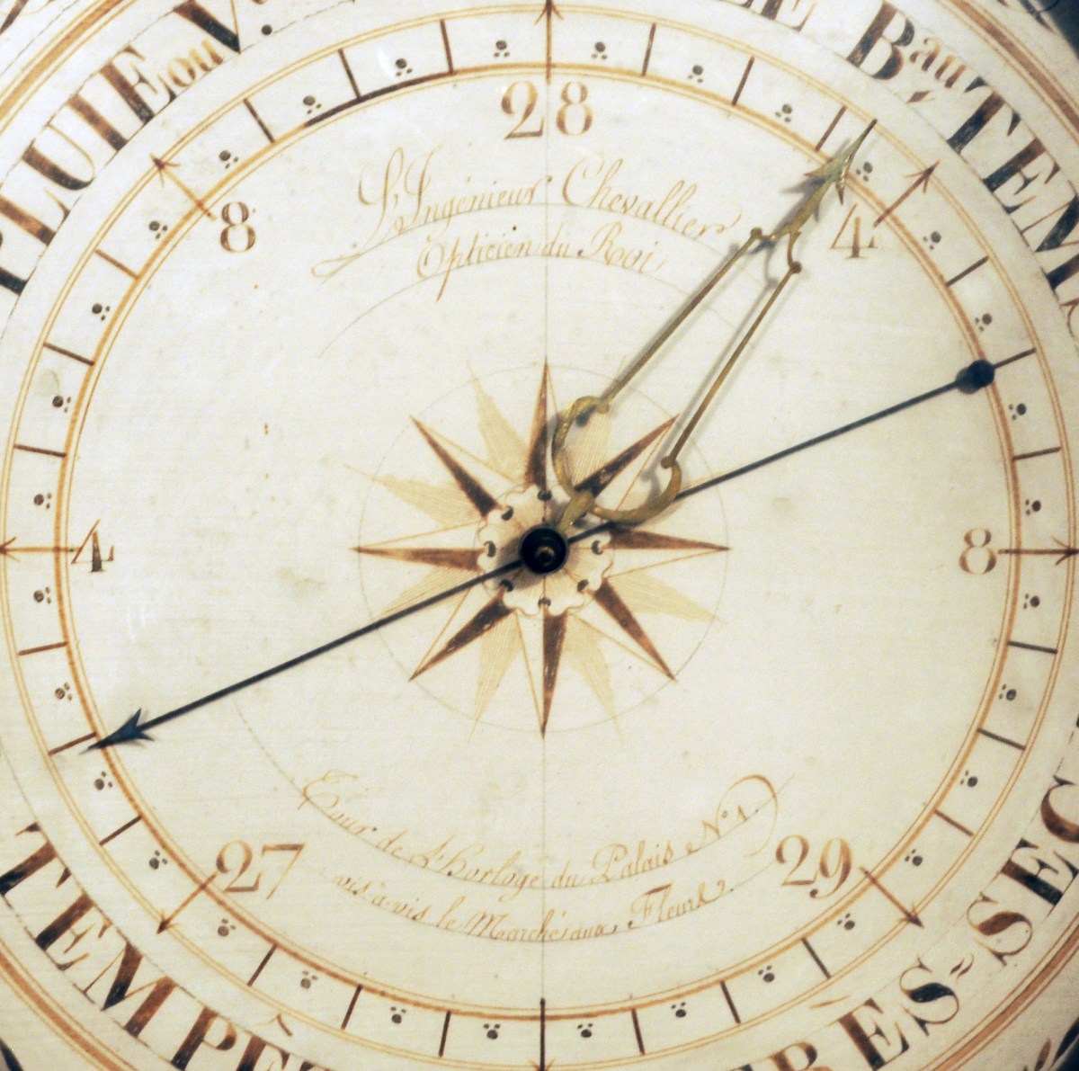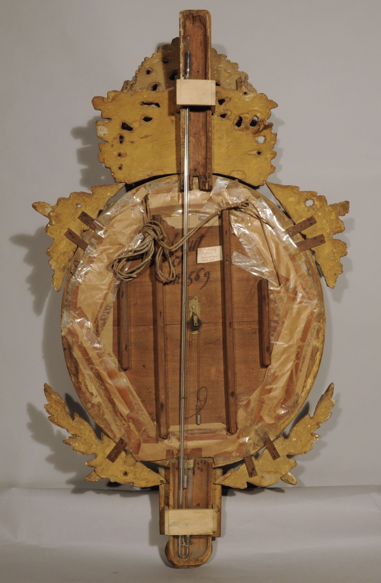 BAROMÈTRE de forme circulaire en bois sculpté et doré. Cadre en bois sculpté, stuqué et doré à feuilles d'eau et rais de perles. Surmonté d'une colombe dans un trophée champêtre couronné d'une guirlande de fleurs et feuilles. Base à cannelures, pomme de pin et guirlandes de laurier.
