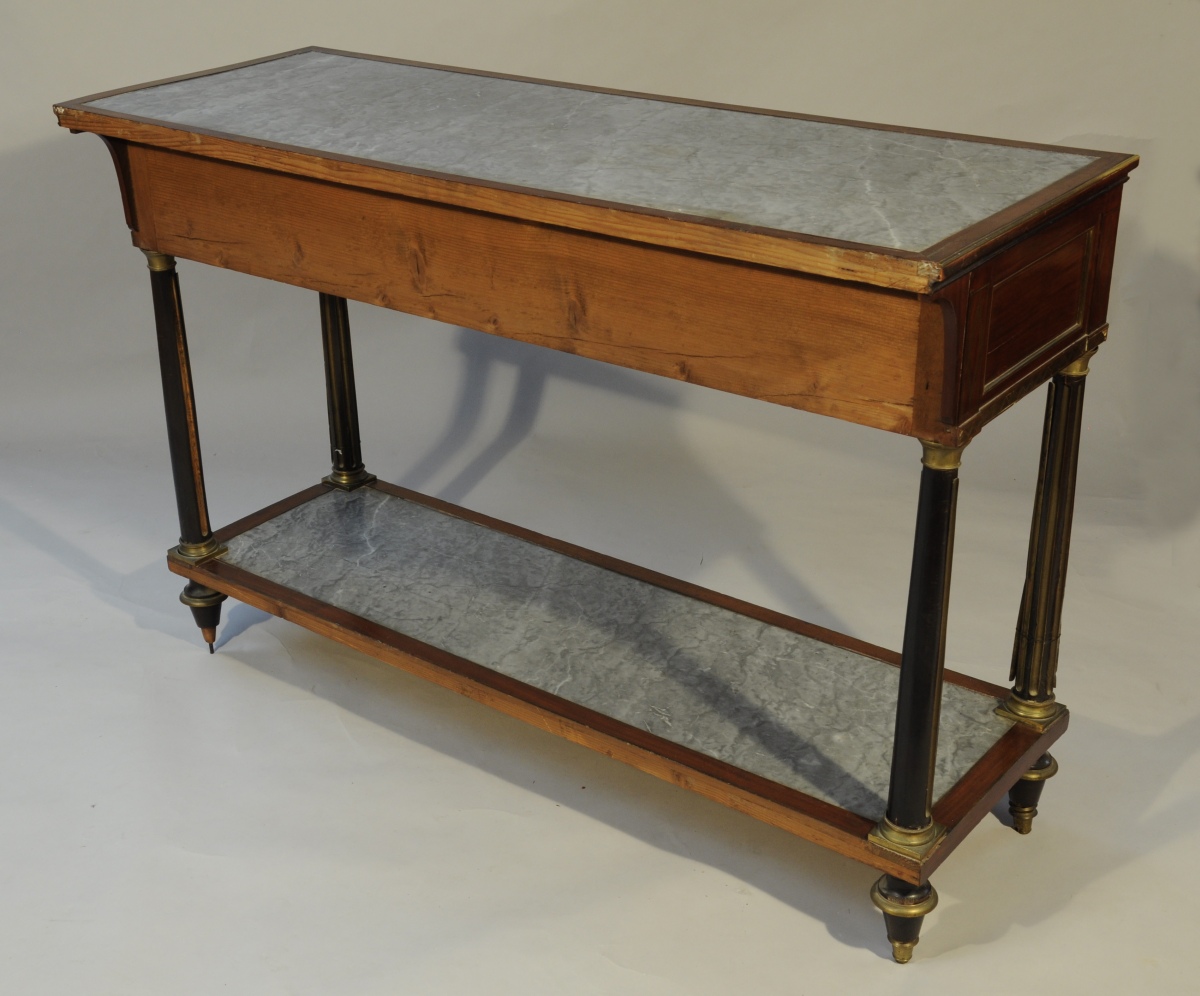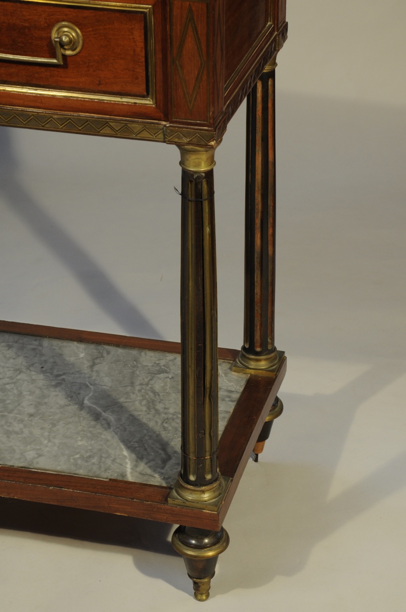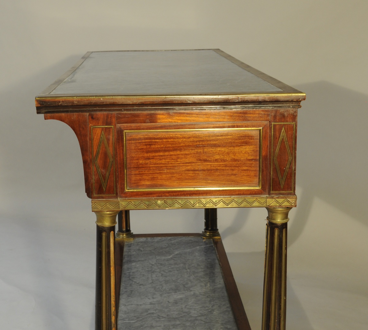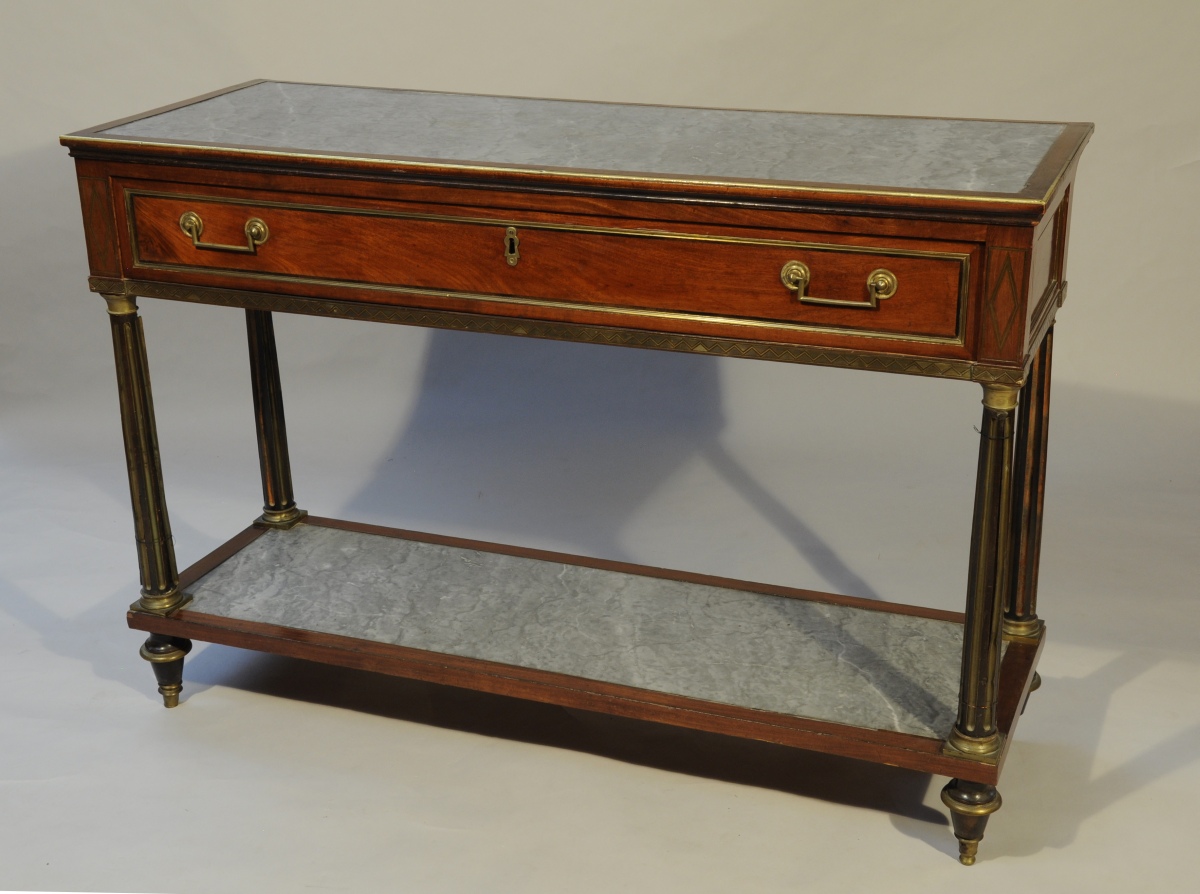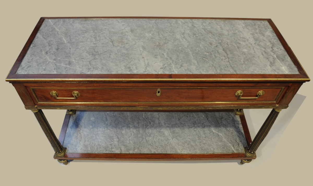 Belle DESSERTE en acajou et placage, formant table à gibier, ouvrant à un tiroir en ceinture. Elle repose sur quatre pieds cannelés réunis pas une entretoise. Le plateau et la table d'entretoise foncés d'un marbre gris. Riches incrustations et ornementation de laiton.