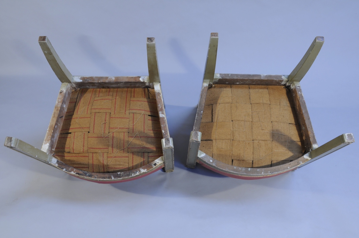 Paire de FAUTEUILS en bois laqué vert d'eau et doré, à dossier plat légèrement incurvé, sculpté en bas relief de deux étoiles. Les bras d'accotoirs ornés de feuilles de chêne. Pieds antérieurs fourreau, postérieurs sabre.