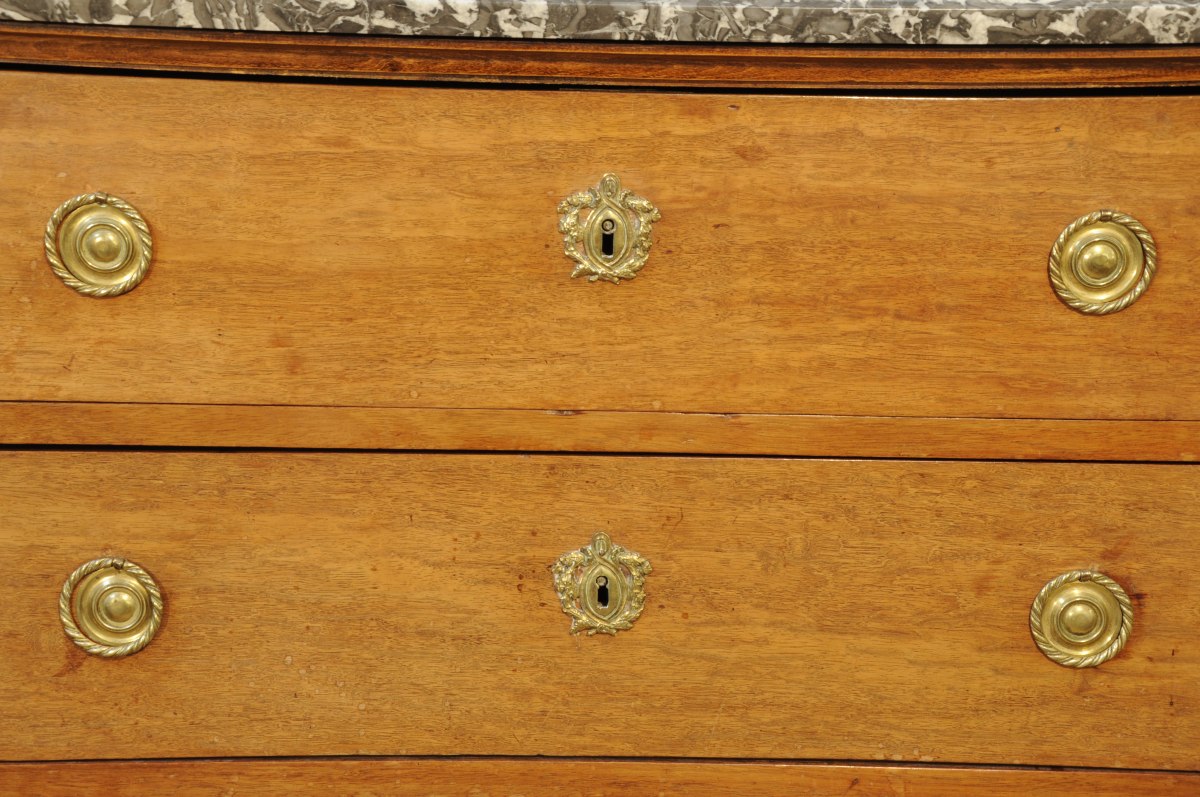 CHIFFONIER en noyer et placage de noyer ouvrant en façade par six tiroirs. Montants à pan coupé cannelé. Ornementation de bronzes tels que entrées de serrure, anneaux de tirage, rosaces. Sommé d'un marbre.
