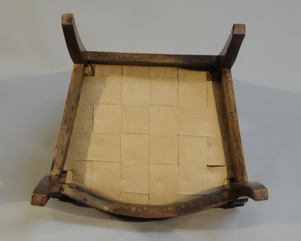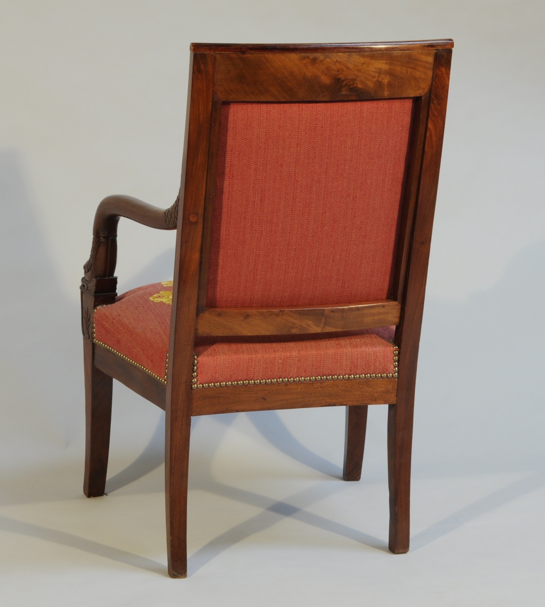 FAUTEUIL en acajou et placage. Les accotoirs aux dauphins surmontant des palmettes. Pieds sabre.