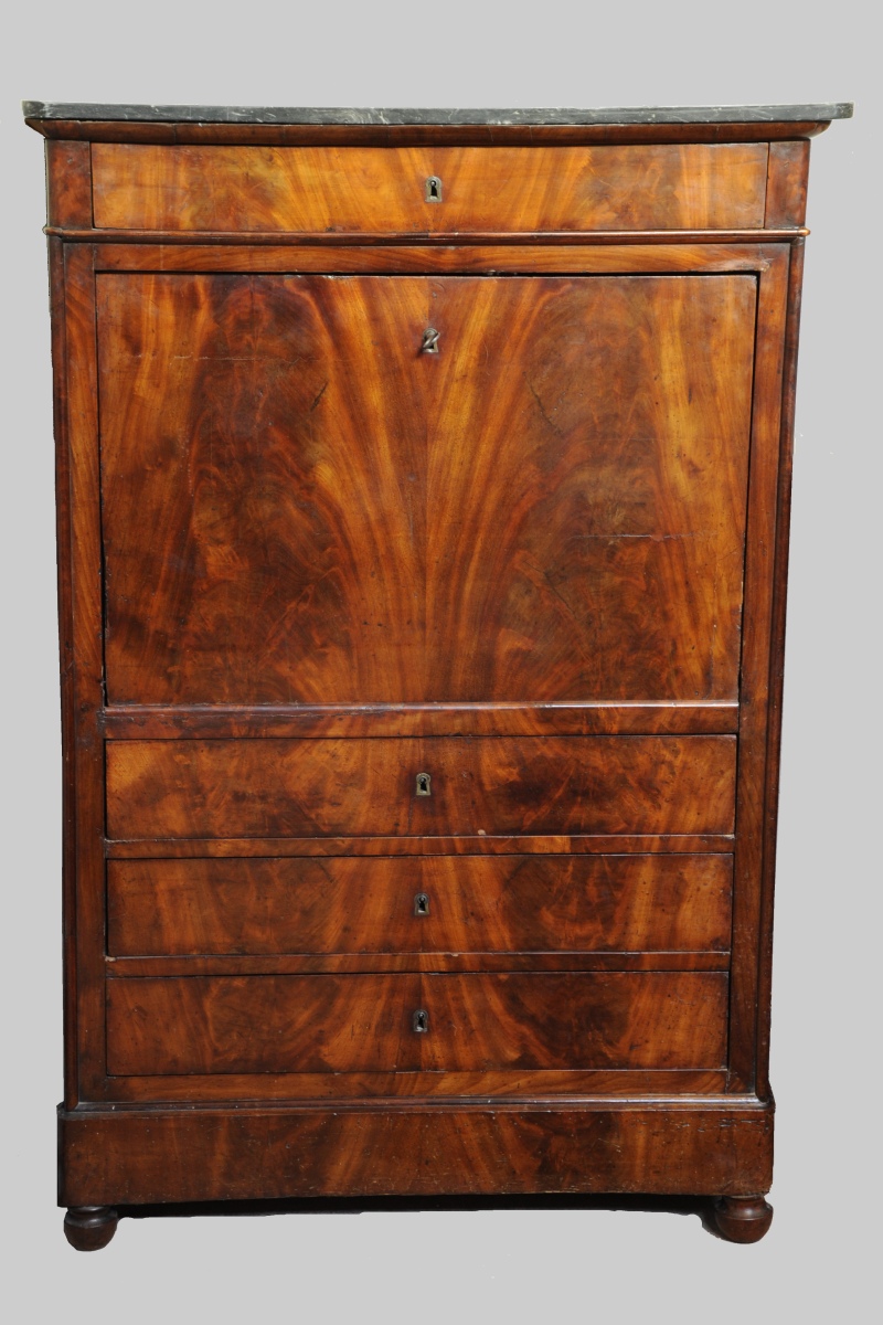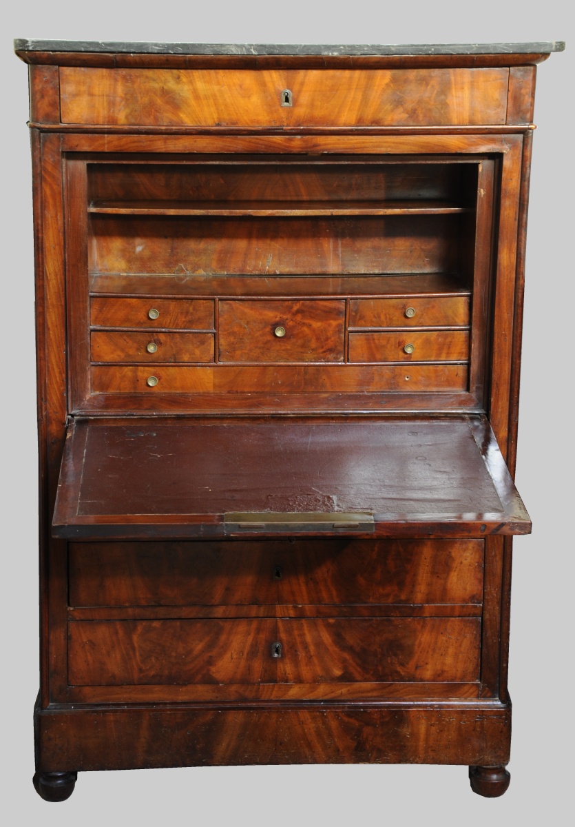 SECRÉTAIRE à abattant en placage de ronce de noyer. Ouvrant à quatre tiroirs en façade. Sommé d'un marbre gris Sainte-Anne.