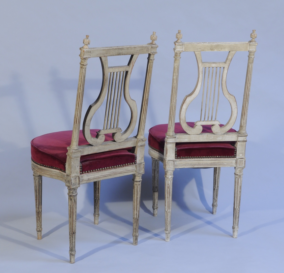 PAIRE DE CHAISES de salon de musique en bois rechampi blanc. Dossier ajouré à une lyre encadrée de deux colonettes. Assise arrondie. Pieds cannelés rudentés.