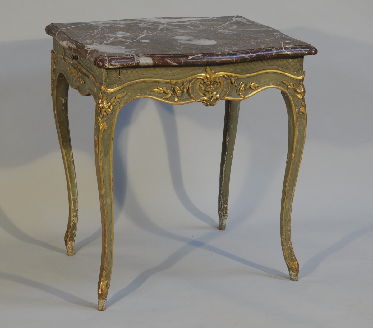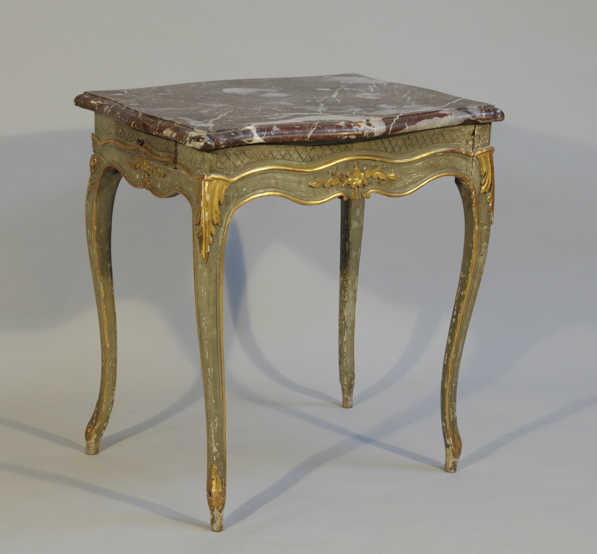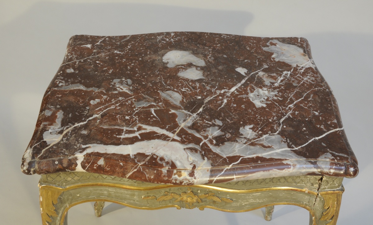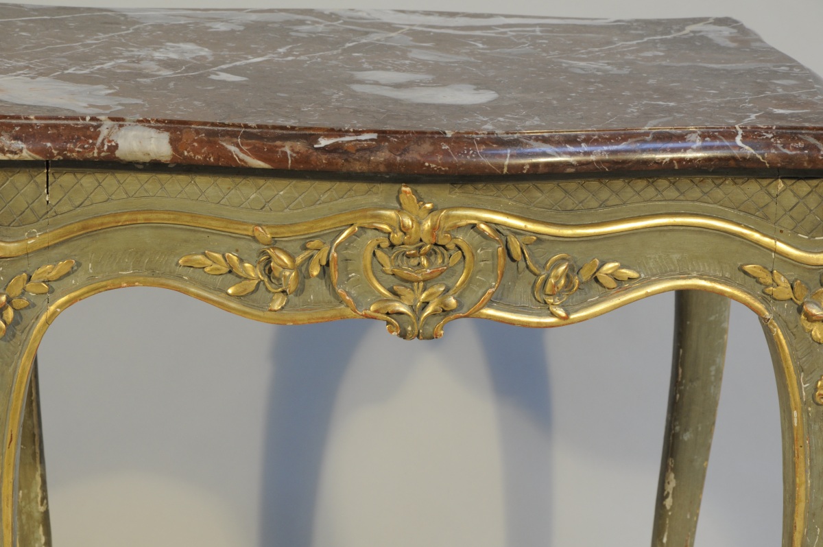 TABLE de MILIEU reposant sur quatre pieds cambrés en bois mouluré, sculpté et doré à fond vert. Ceinture, chutes et pieds ornés de fleurettes, acanthes et fonds de quadrillage. Ouvrant sur les côtés par deux tiroirs. Marbre griotte de Hautmont.
