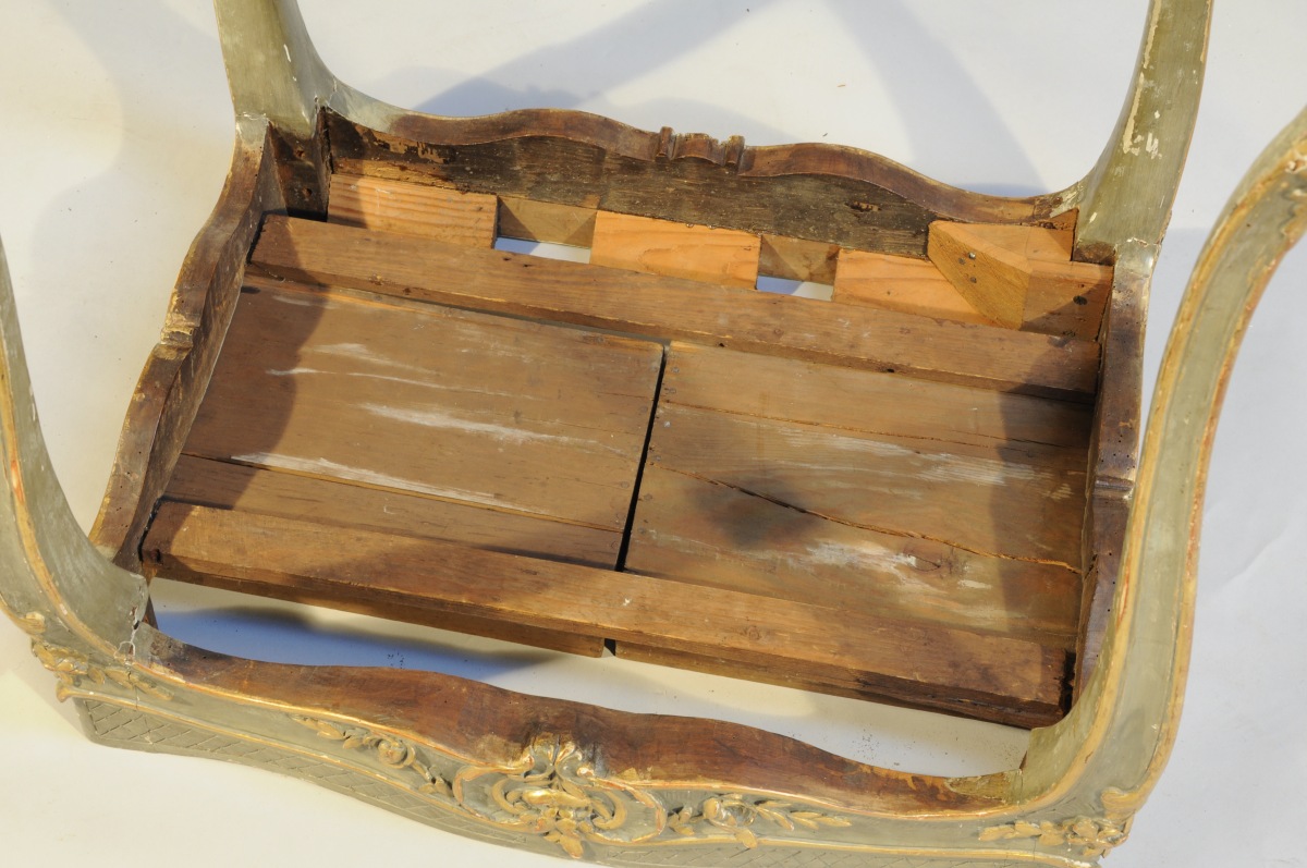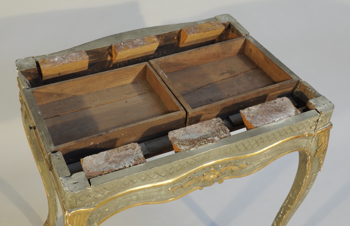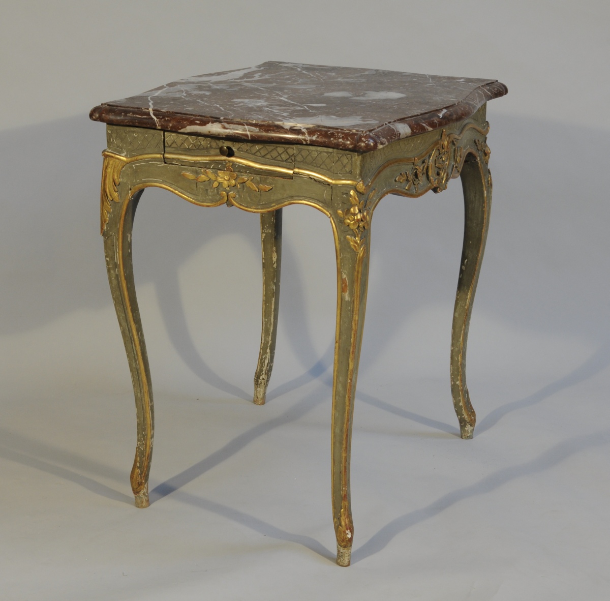 TABLE de MILIEU reposant sur quatre pieds cambrés en bois mouluré, sculpté et doré à fond vert. Ceinture, chutes et pieds ornés de fleurettes, acanthes et fonds de quadrillage. Ouvrant sur les côtés par deux tiroirs. Marbre griotte de Hautmont.