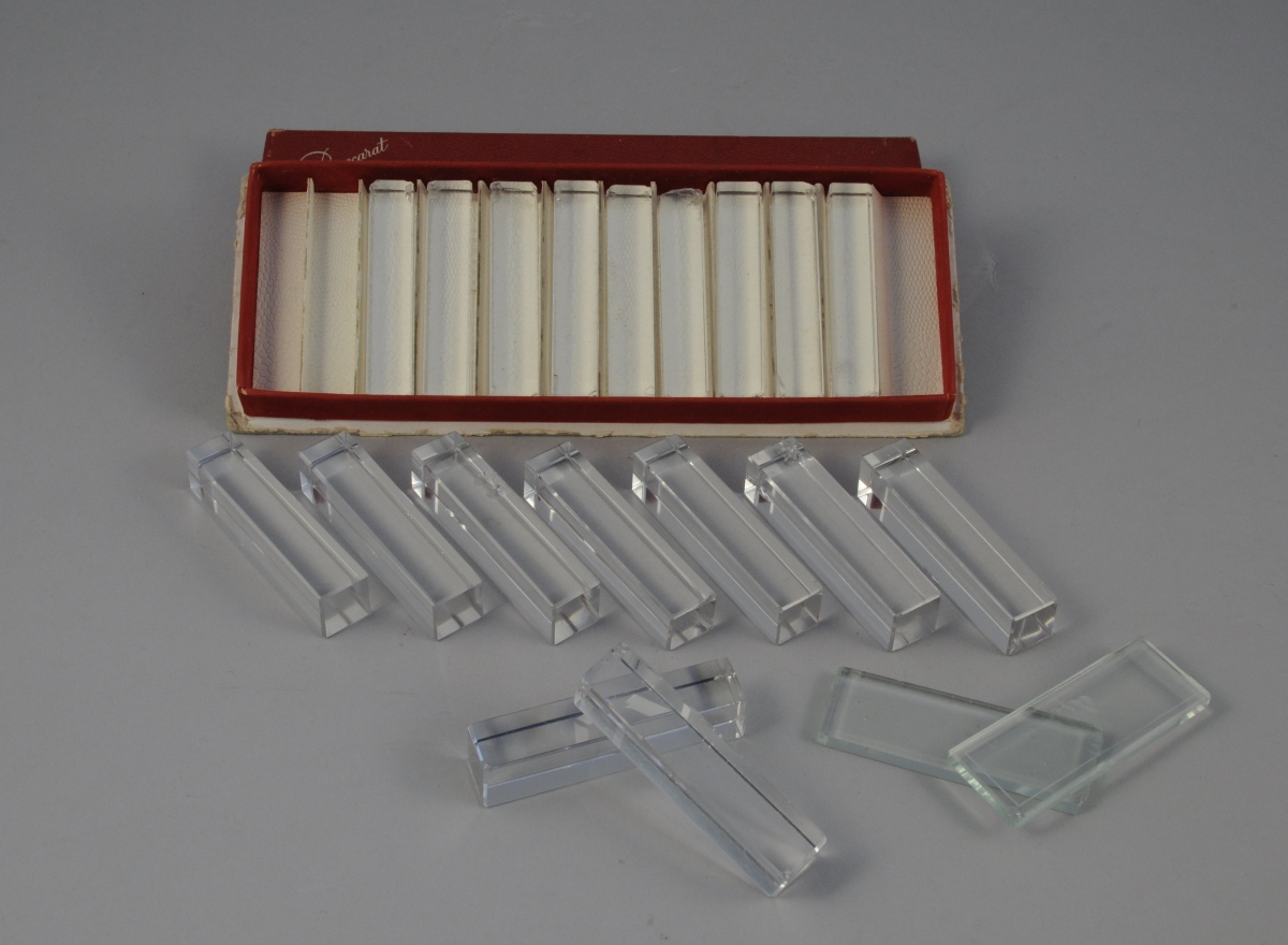 18 PORTE-COUTEAUX rectangulaires en cristal. 9 de BACCARAT, 9 de la "CRISTALLERIE DE LORRAINE". (accidents, manques).