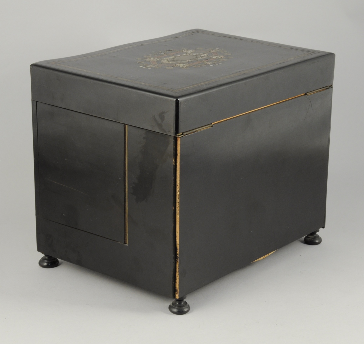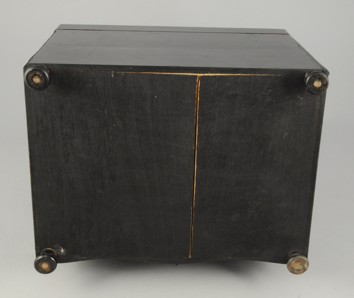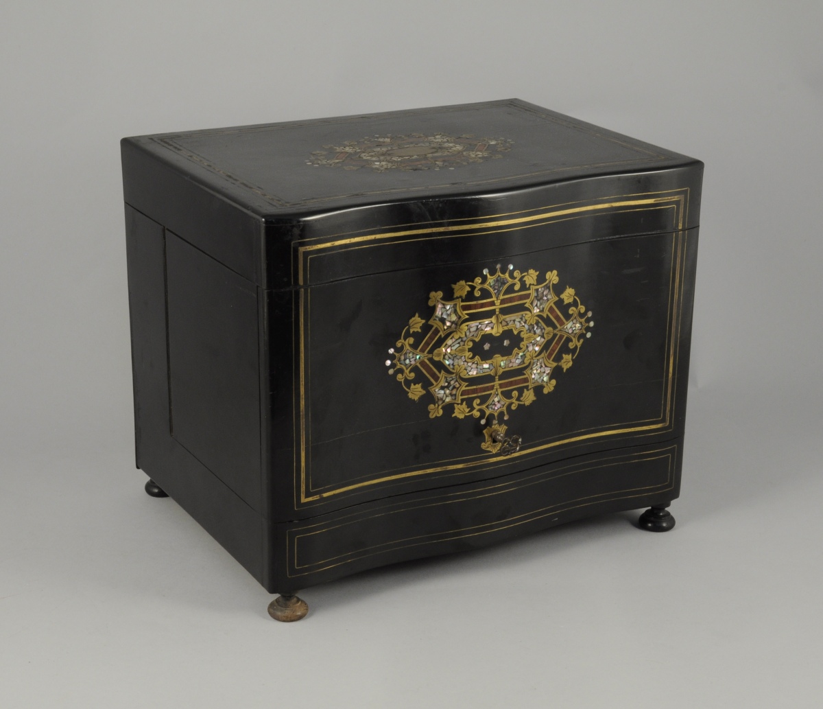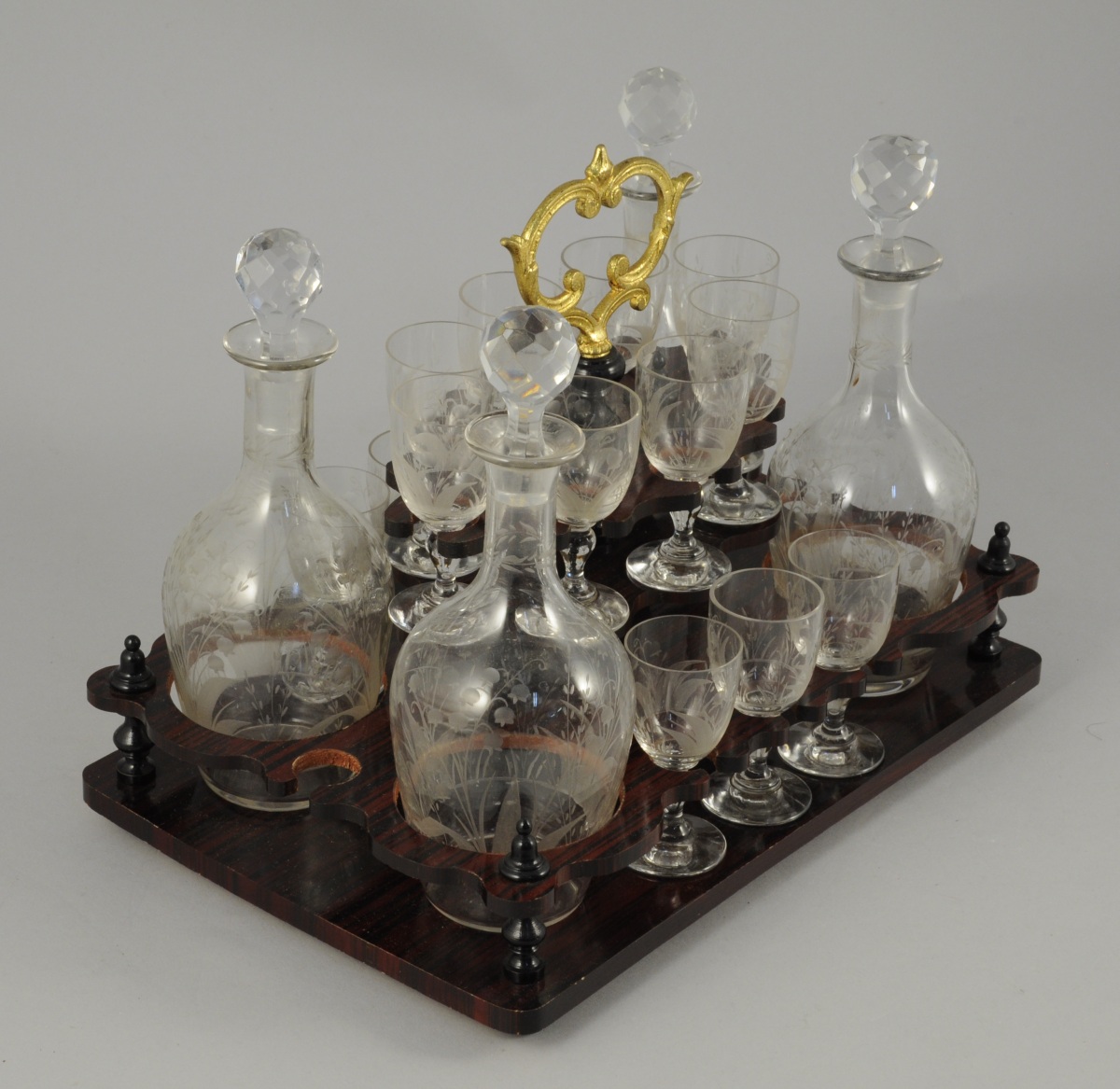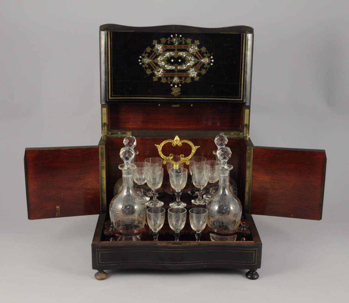 CAVE À LIQUEURS. Caisse en bois noirci avec filets et incrustations de style Boulle. Intérieur complet en cristal gravé de fleurs à clochettes, muguet: 4 carafons et 14 verres.