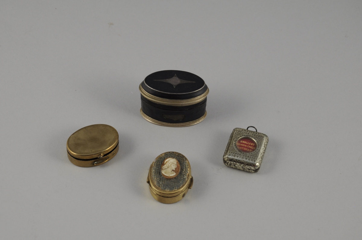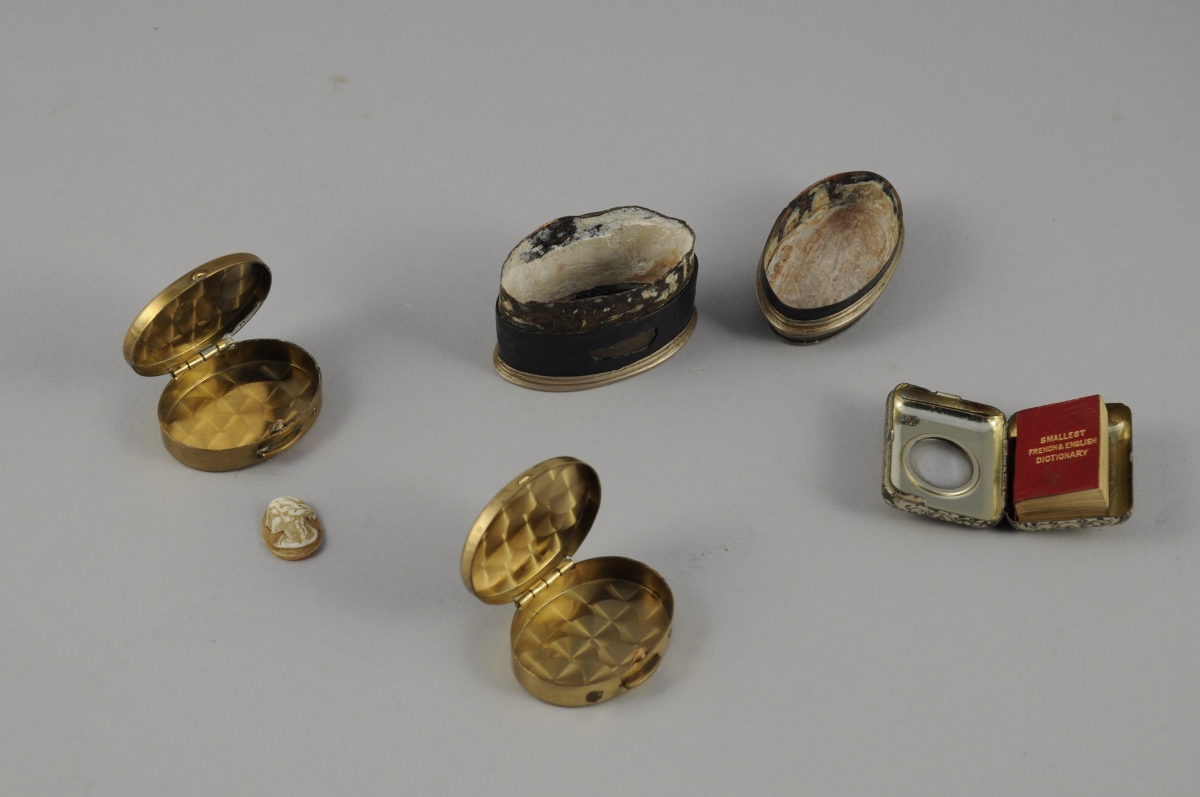 - "The Smallest French & English Dictionnary". Dictionnaire français-anglais miniature dans une petite boite en métal doré avec une bélière. Long. 3,5, Larg. 2,5 cm. (usures)