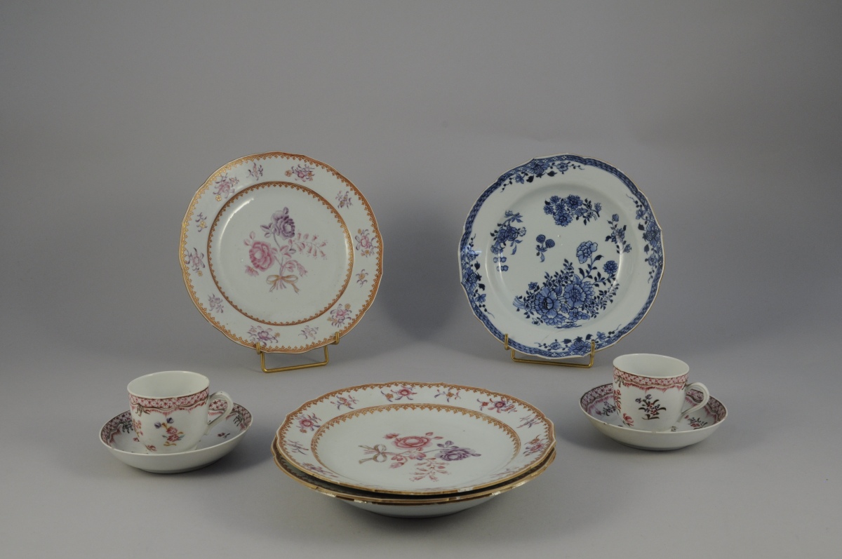 Suite de trois ASSIETTES plates en porcelaine de la famille rose. Ornées d'un bouquet de fleurs, frise de festons et fleurettes sur l'aile. XIXè.