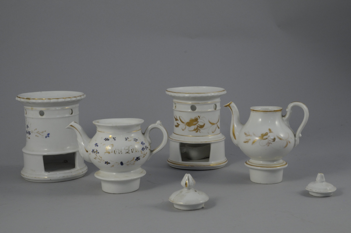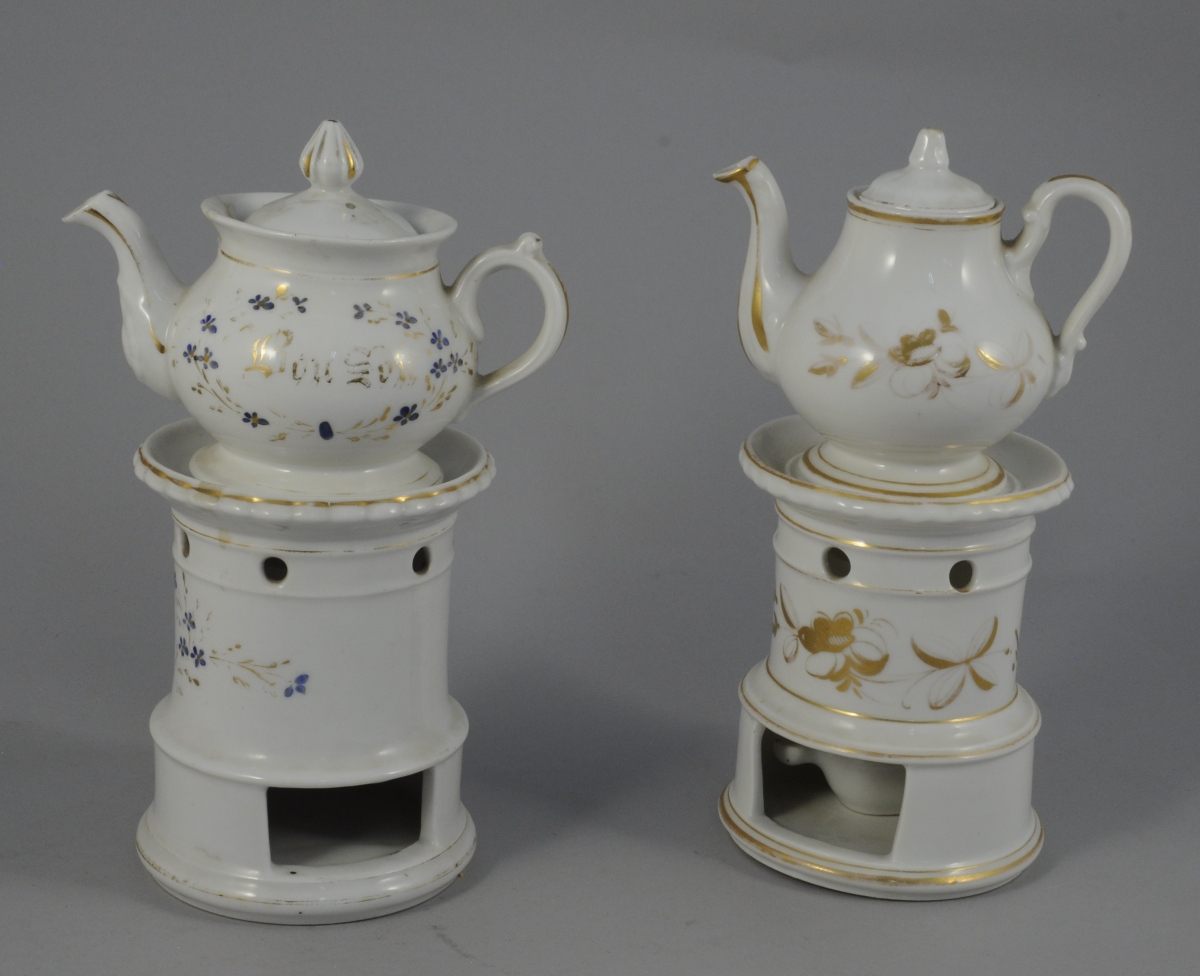 PARIS (?) 2 TISANIÈRES en porcelaine polychrome. Fond blanc à fleurs dorées pour l'un et à semi de fleurettes bleues et or encadrant l'inscription " Bonne Nuit " pour l'autre.