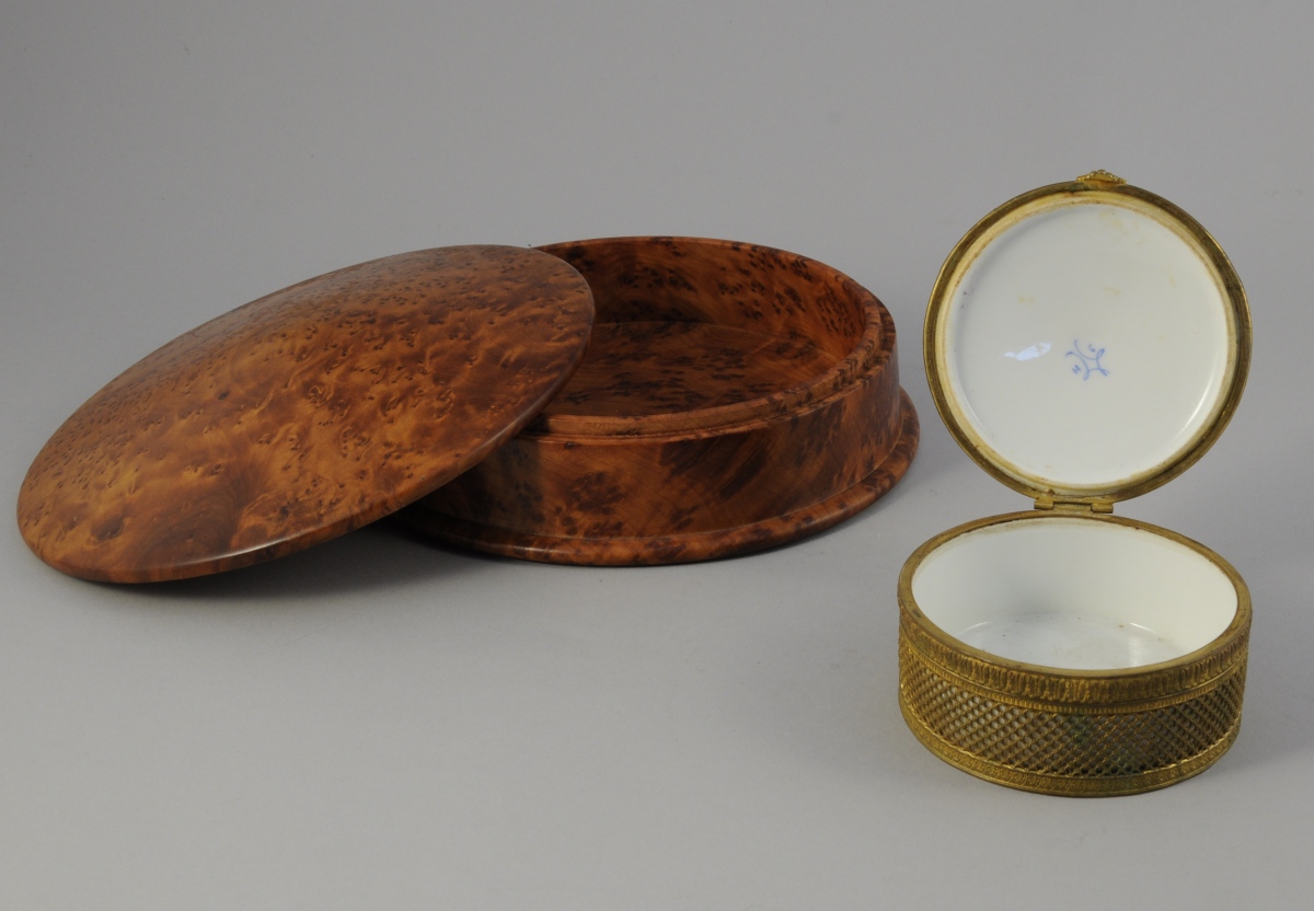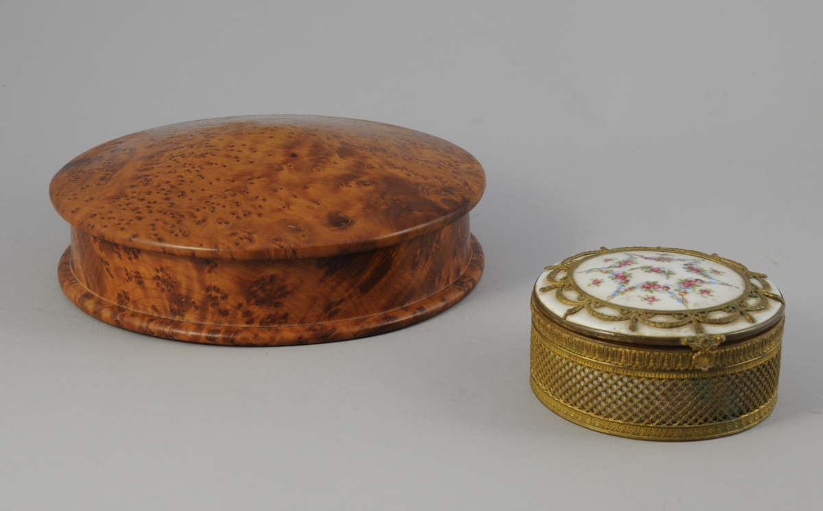 Joint: BOÎTE ronde en loupe de thuya. Diam. 21,5, Prof. 5,5 cm.
