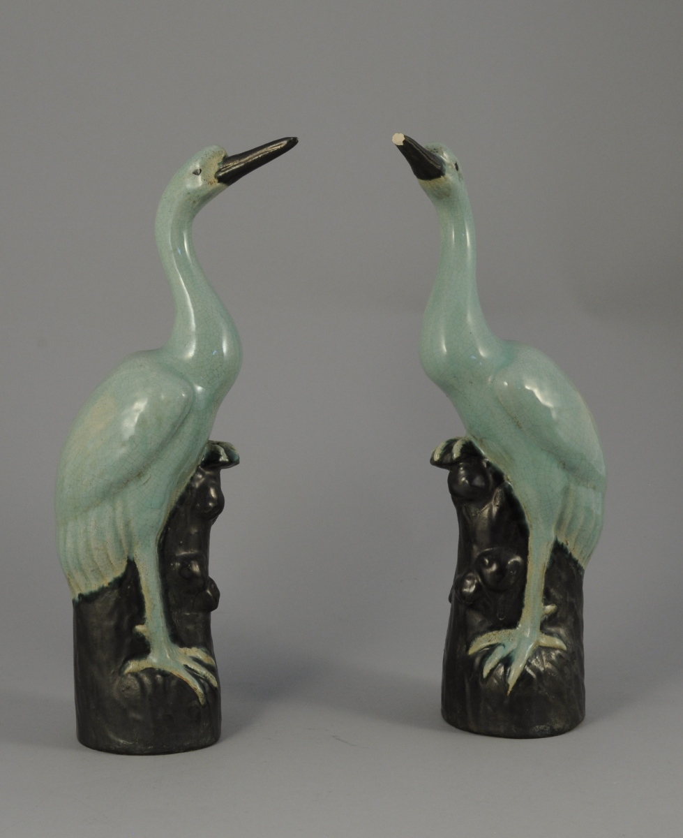 CHINE (?) COUPLE de HÉRONS en faïence. Les hérons en émail bleu craquelé et les rochers argentés.