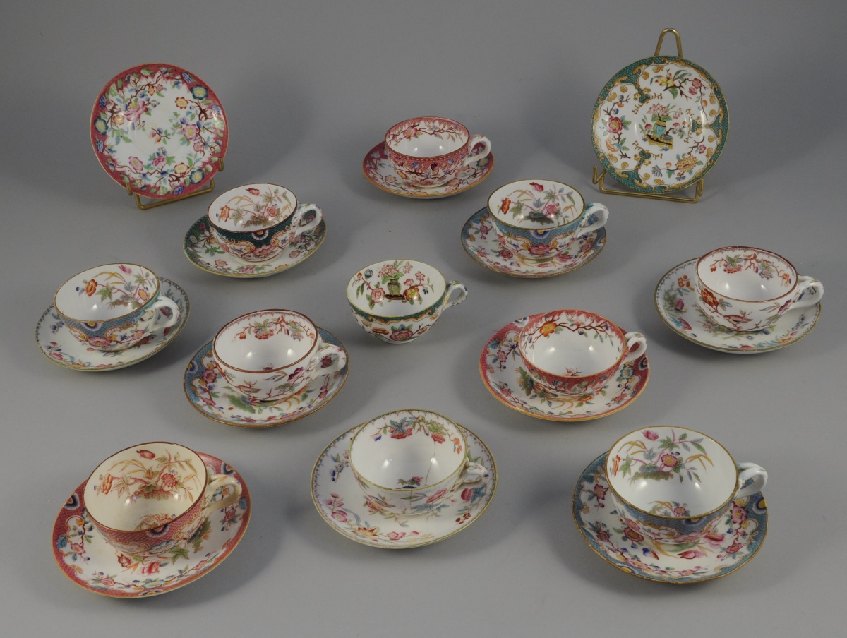 MINTON (gendre de). Lot de 22 pièces de céramiques comprenant 11 tasses et 11 sous-tasses de divers modèles à camaïeu bleu, vert et rose.