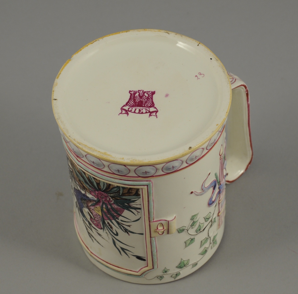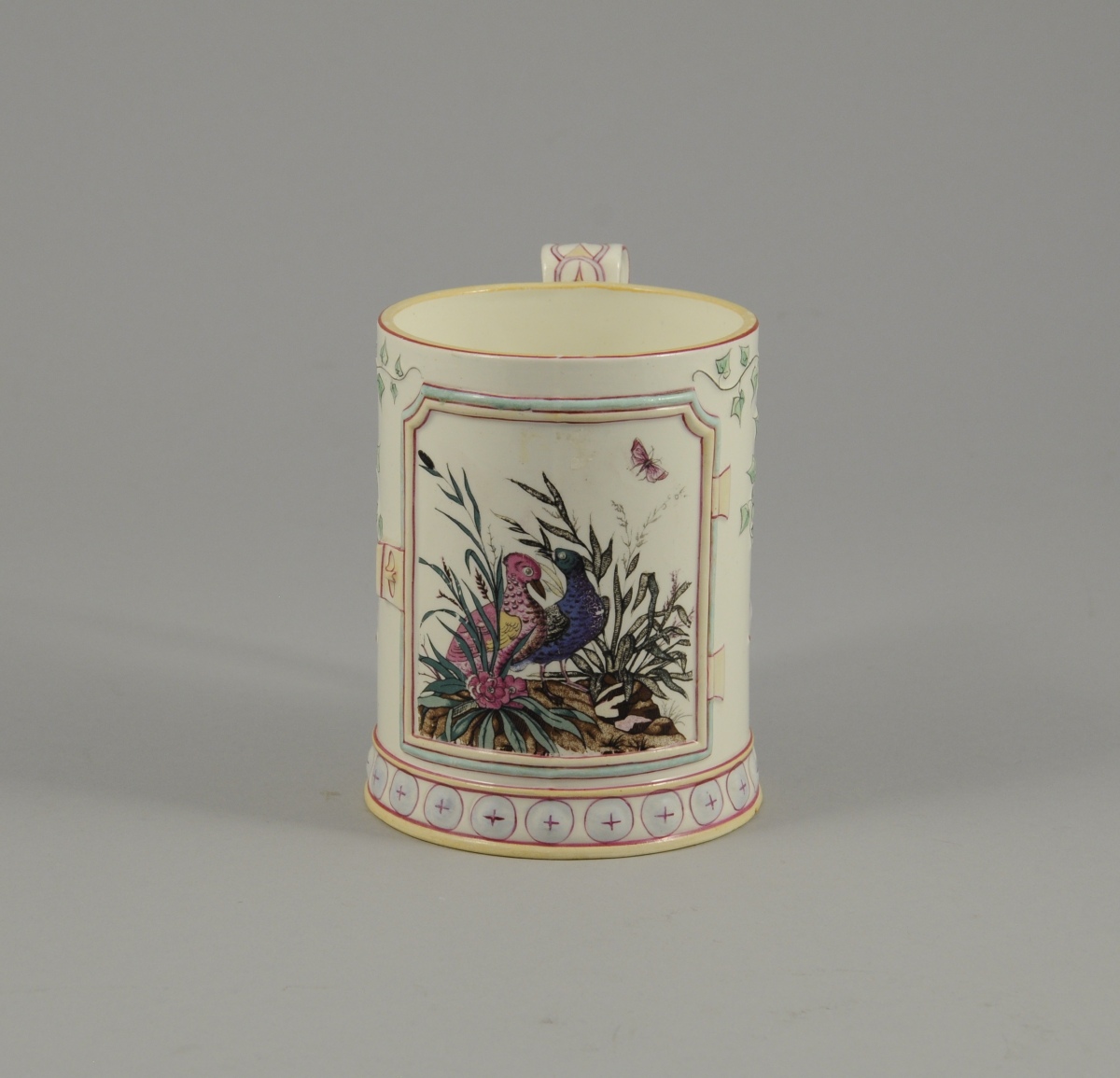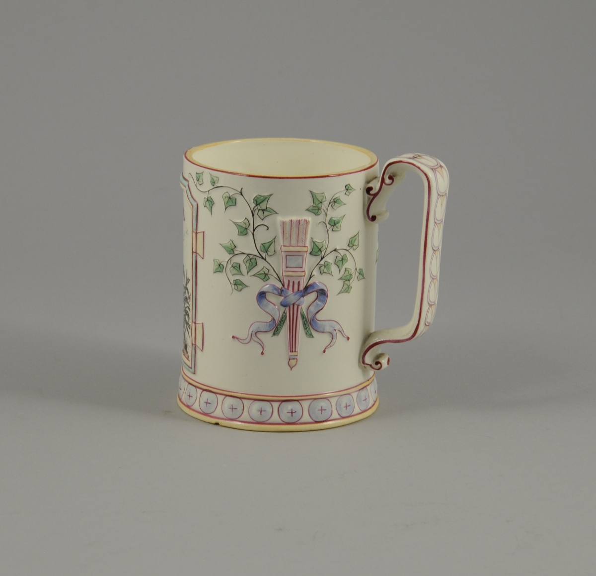 GIEN. CHOPE À ANSE en faïence orné de de deux oiseaux dans une réserve encadrée de deux carquois enrubannés, frise de perles et de piastres à la base et sur l'anse.
