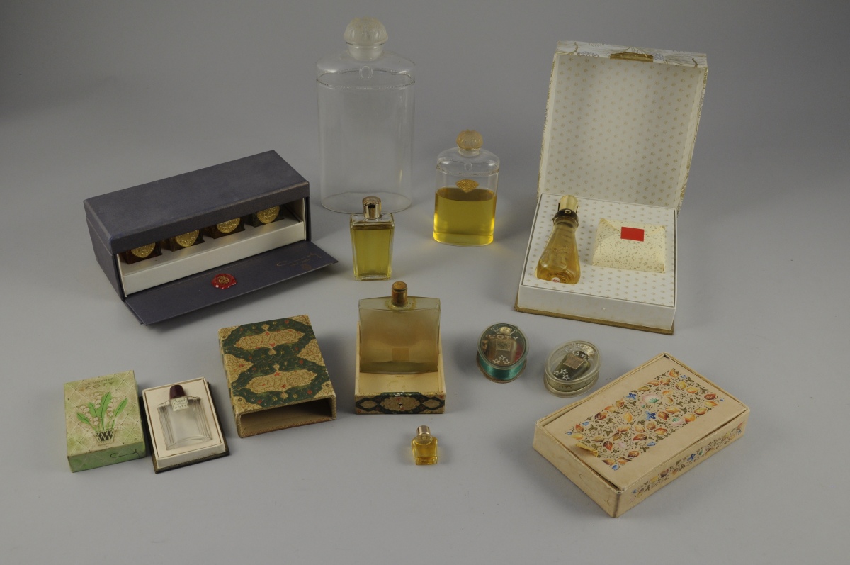 L'ORIGAN, JASMIN DE CORSE, ÉMERAUDE, LA ROSE JACQUEMINOT (Haut. 5cm, coffret Coty 1904-2004); ÉMERAUDE (Haut. 8,5 cm, coffret, accident); CORDON ROUGE (Haut. 14 cm, coffret avec savon); JASMIN DE CORSE (Haut. 12 cm.); JASMIN DE CORSE (Haut. 12 cm.); L'AIMANT (Haut. 8,5 cm.); MUGUET (Haut. 6,5 cm, coffret); CHYPRE (Haut. 4,5 cm, boîte en plastique); MUGUET (Haut. 4,5 cm, boîte en platique); IMPRÉVU (Haut. 3 cm.).