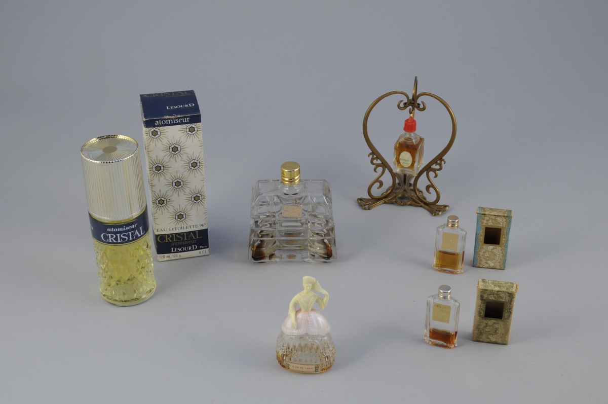 CRISTAL (Haut. 10 cm.); FLEUR DE TABAC (Haut. 8,5 cm.); MARJOLYS (Haut. 6 cm, boîte); CHYPRE DE PARIS (Haut. 6 cm, boîte); BOUQUET, avec présentoir LAMPADAIRE (Haut. flacon: 6, Haut. présentoir: 13 cm.); CRISTAL, atomiseur (Haut. 15 cm, boîte).