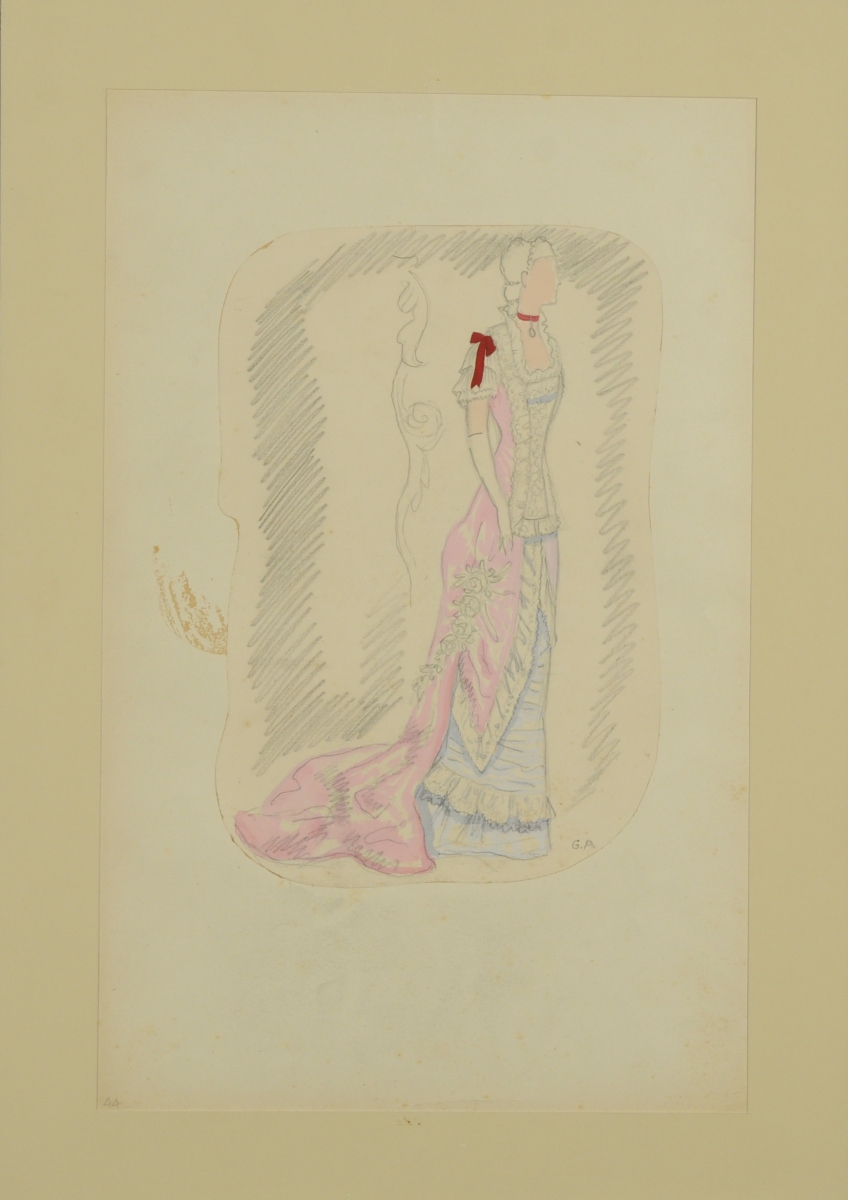Projet de costume - Robe rose dans le goût de la fin du XVIIIème siècle avec étude de rinceaux.