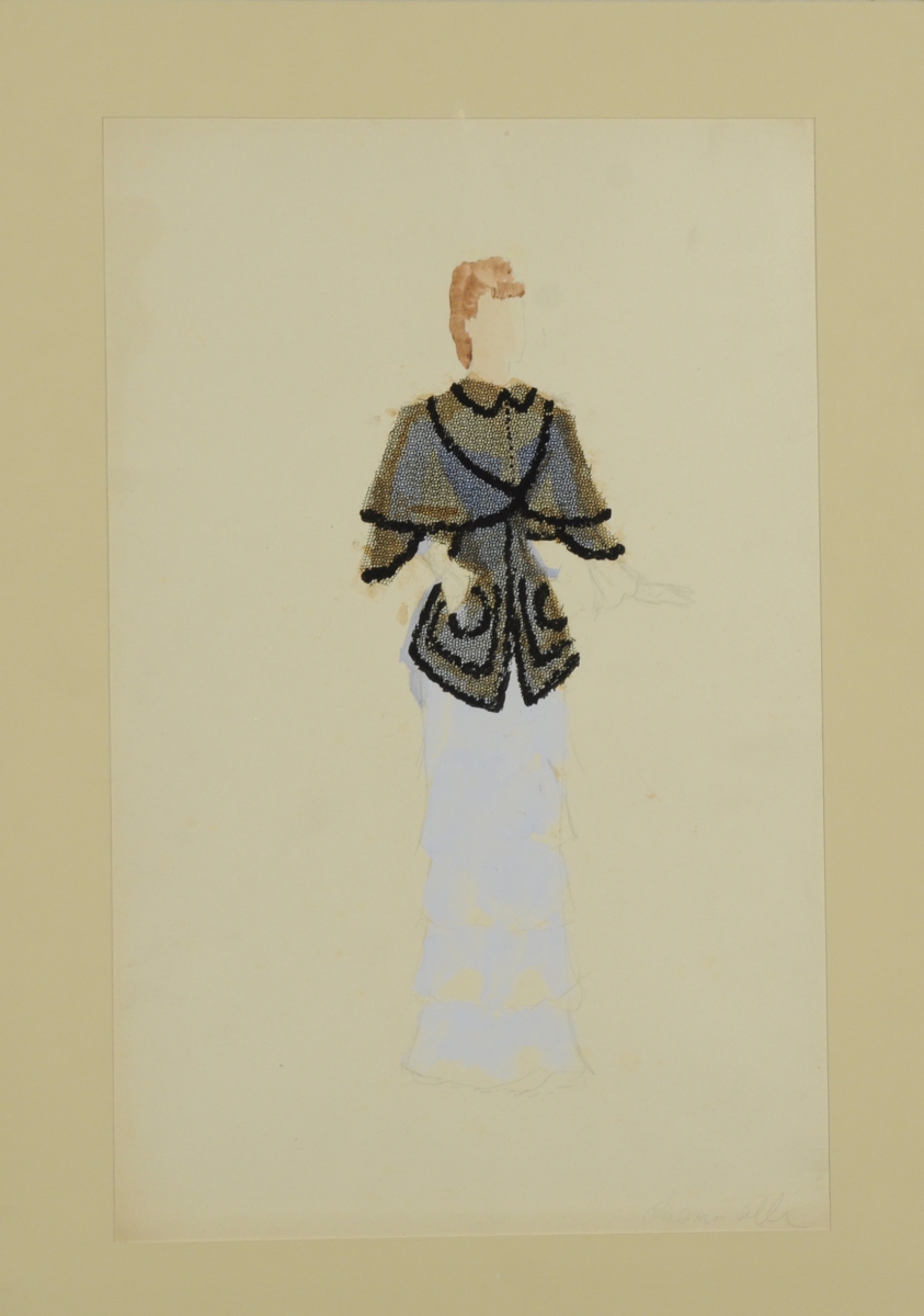 Crayon, aquarelle et application de tulle noir. Porte l'inscription "Demoiselle" en bas à droite.