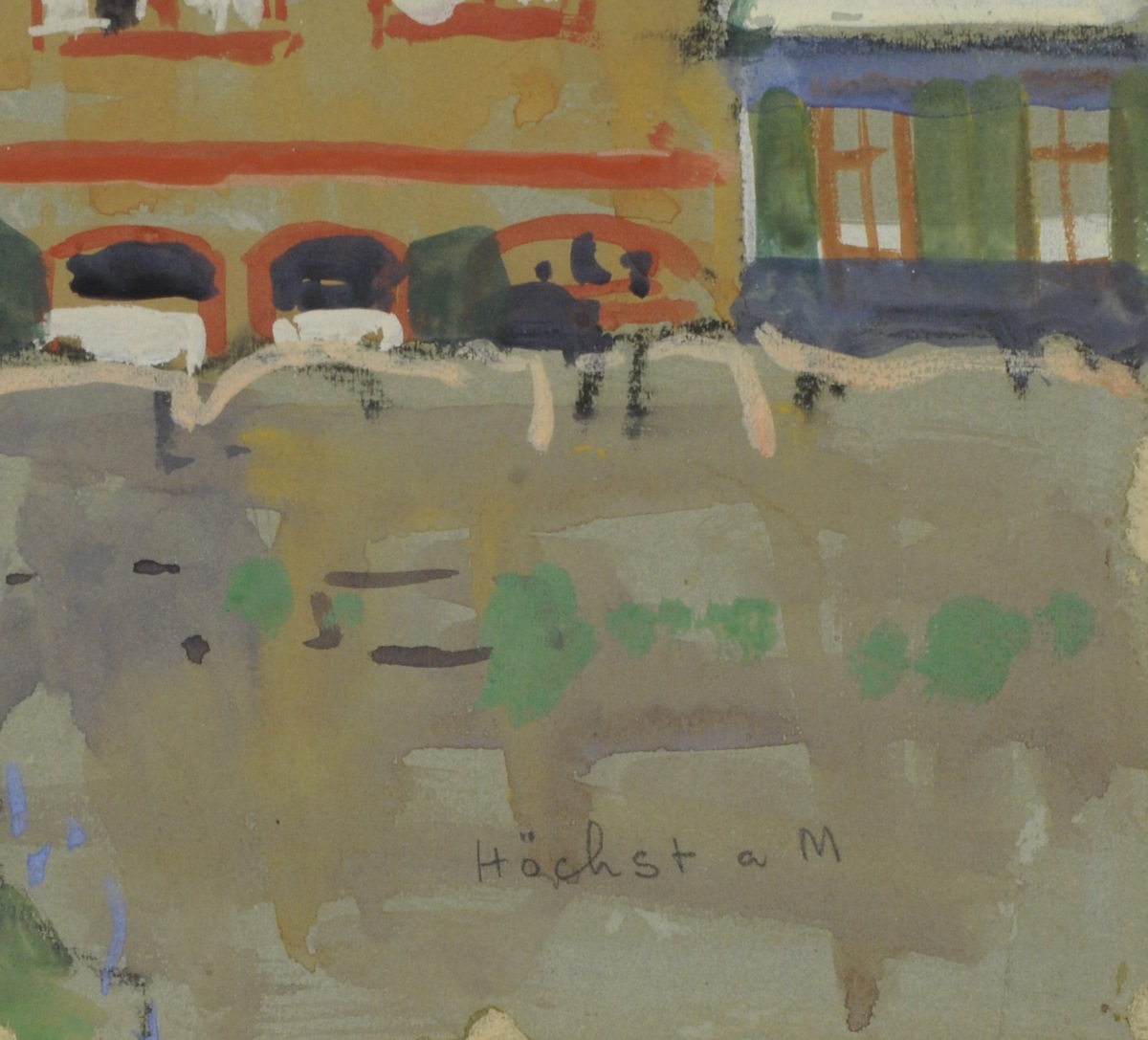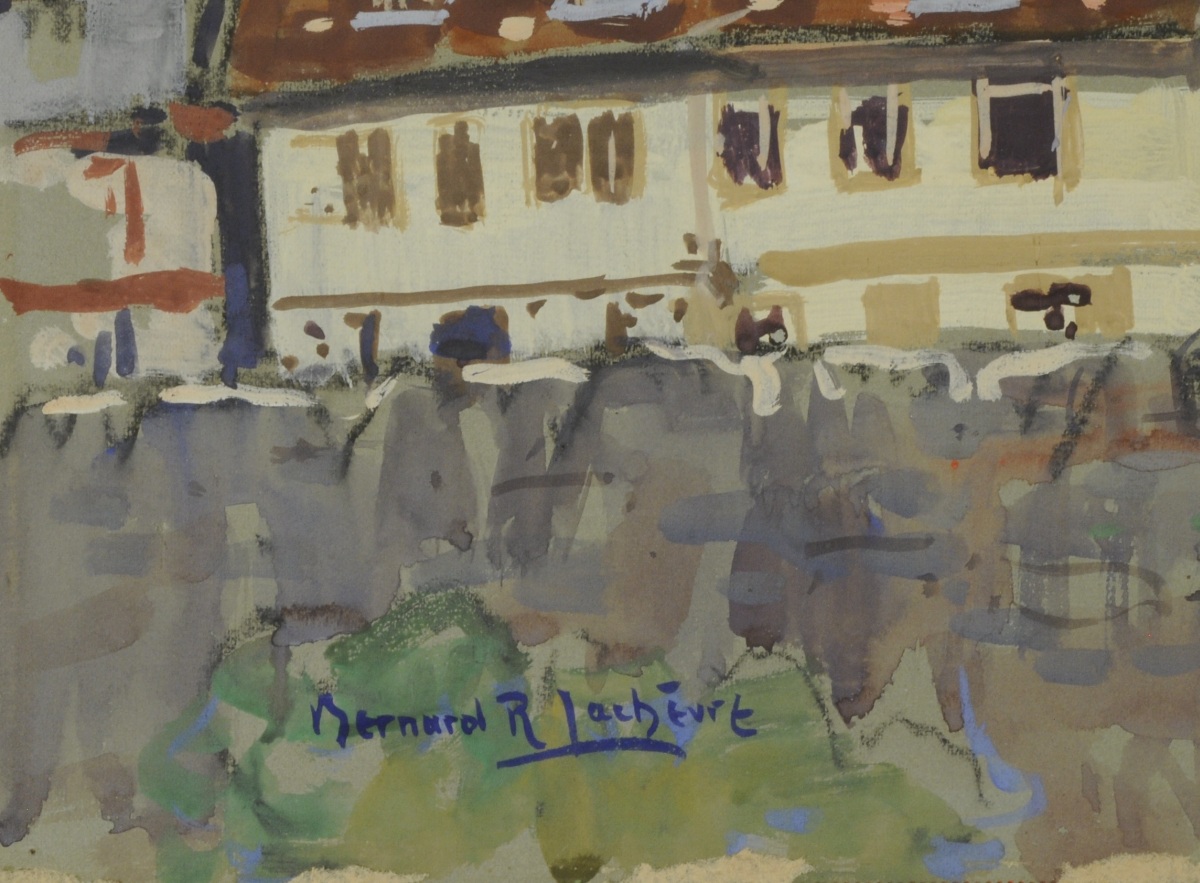 Aquarelle et gouache marouflée sur carton, signée en bas à gauche et titrée en bas à droite. Porte une inscription " Les vieilles maisons du rempart / Bernard R. Lachèvre / 1 [..] noir "
