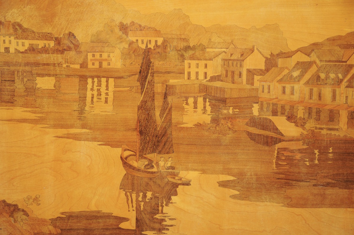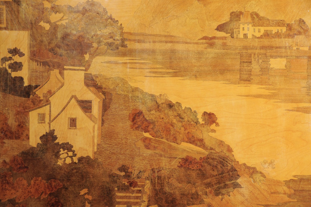 Exceptionnel panneau en marqueterie de bois et loupe d'essences variées. Signé en bas à droite.