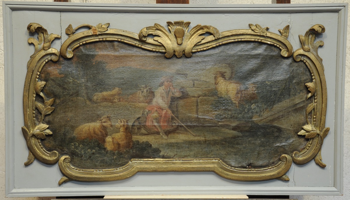 Huile sur toile dans un encadrement en bois sculpté, doré et laqué gris. Ancien dessus de porte.