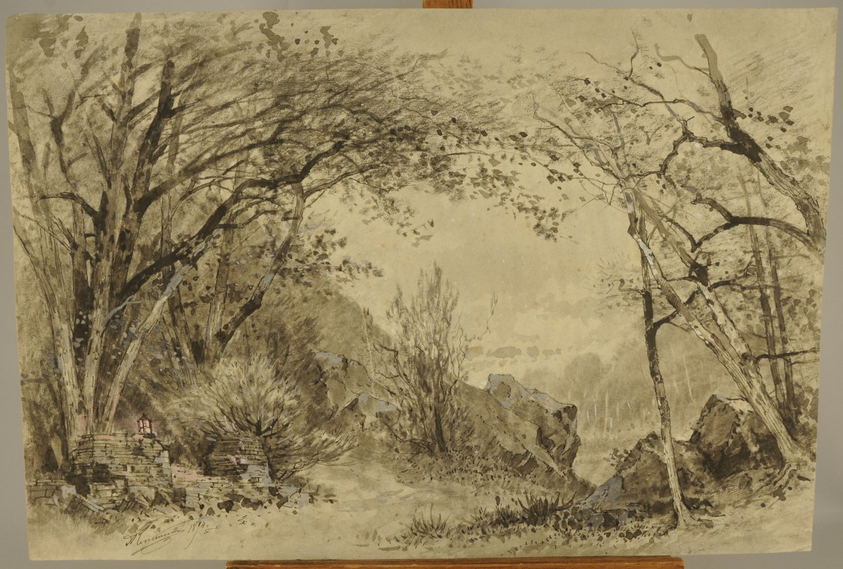 - Ruines dans un paysage. Crayon et rehauts de craie blanche, signé en bas à gauche. 42,3 x 55,3 cm. (quelques déchirures)