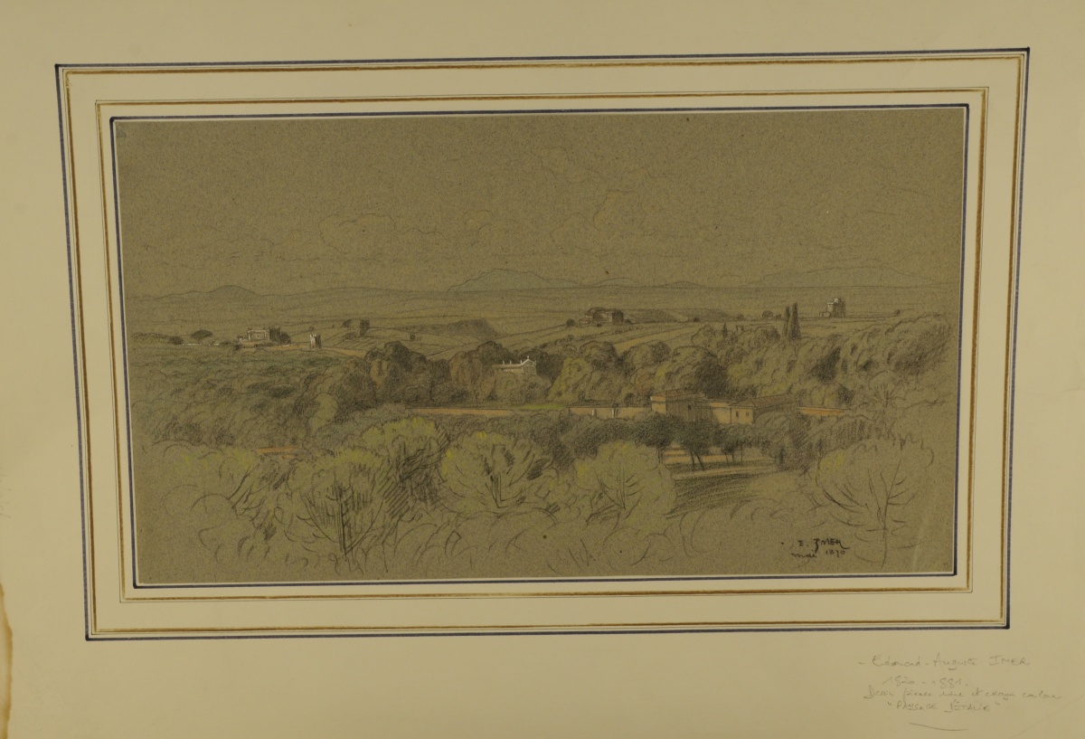 - Paysage d'Italie. Pierre noire et rehauts de craies de couleur, signée et datée " mai 1870 " en bas à droite. 24,3 x 43,6 cm.