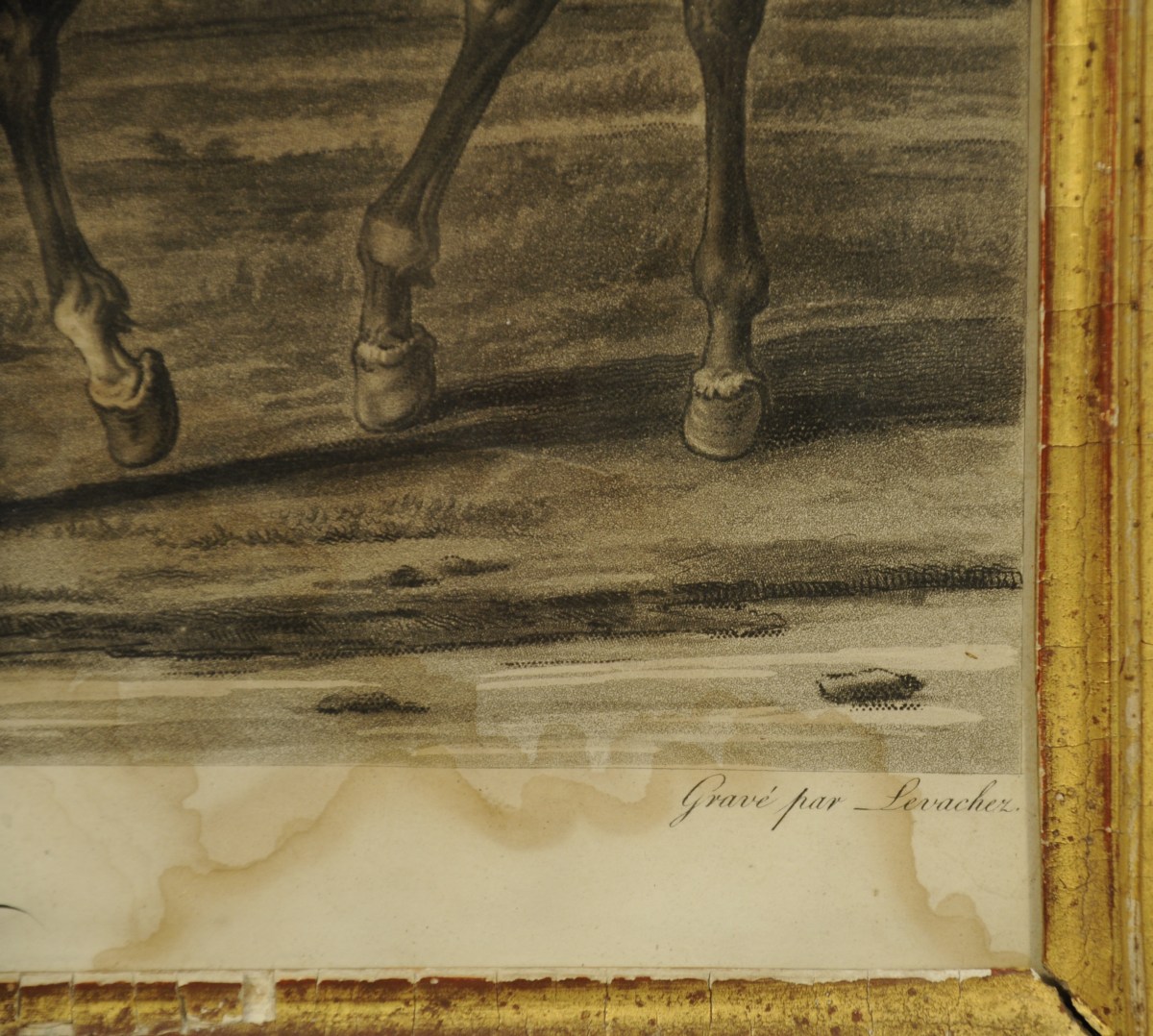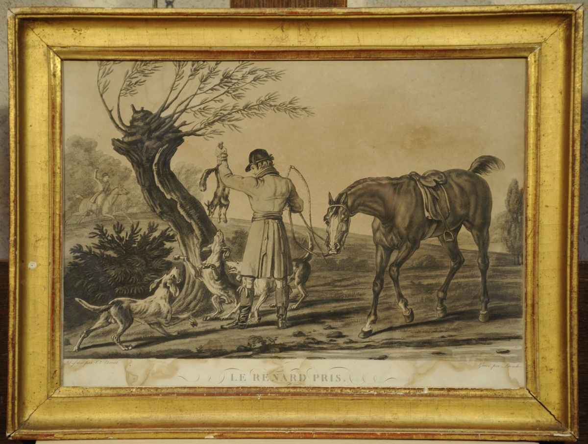 - D'après Carl VERNET et gravé par Levachez. Deux scènes de chasse au renard. 36 x 47 cm. (humidité, manques aux cadres).