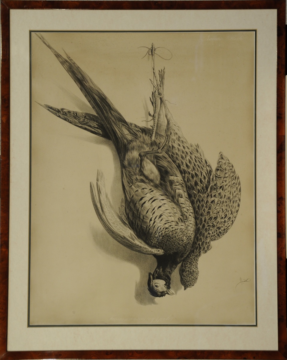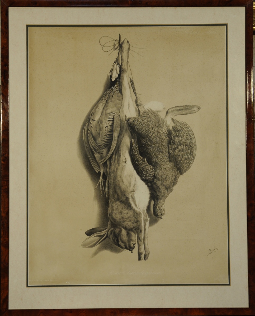 Deux gravures. Natures mortes cynégétiques. Perdrix et lapin. Faisan et Poule.