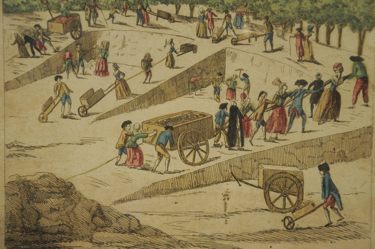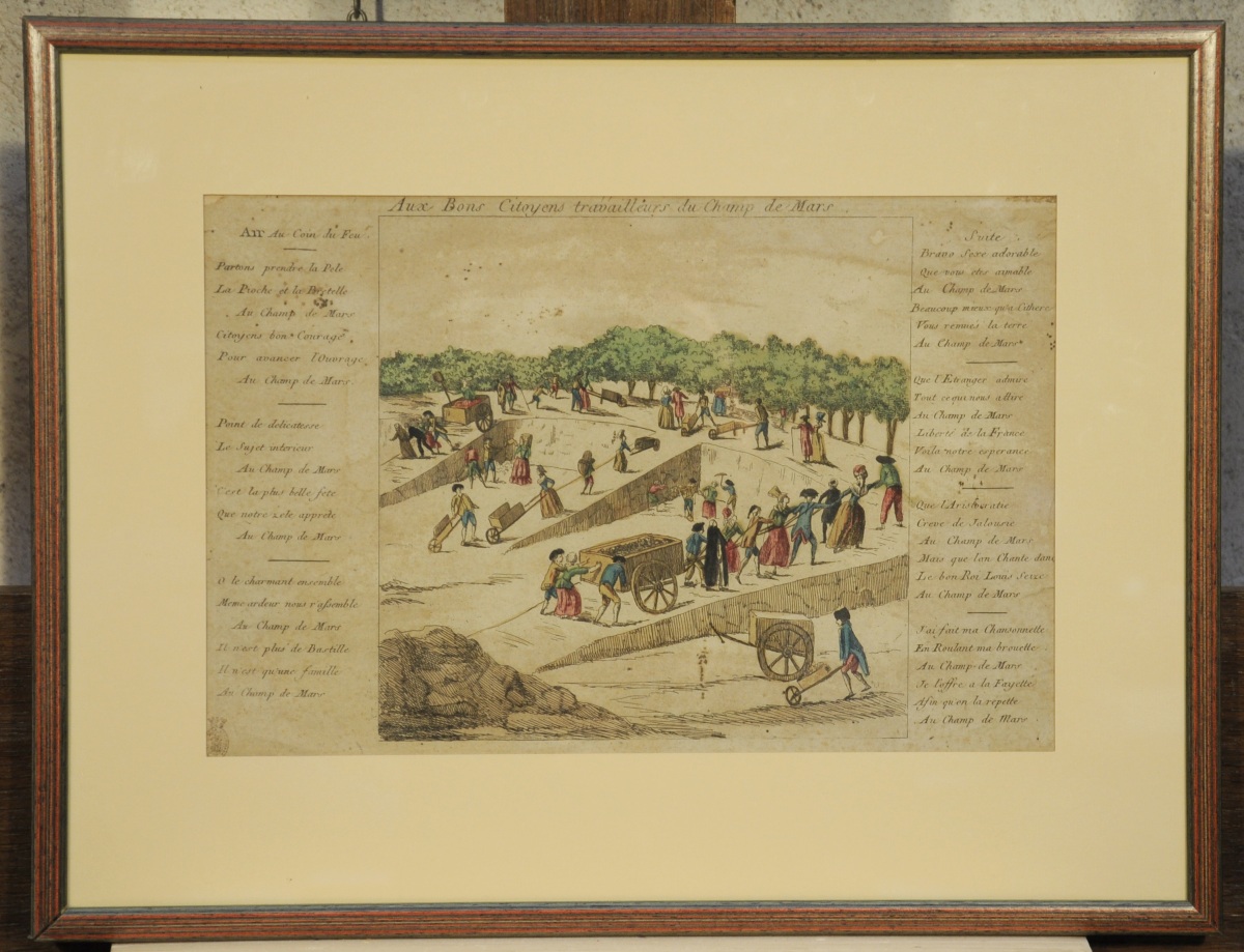Bois gravé et réhaussé en couleur, illustrant les travaux de terrassement préaprant la fête de la Fédération, le 14 juillet 1790. Cachet "Biblioteca Lindesiana"