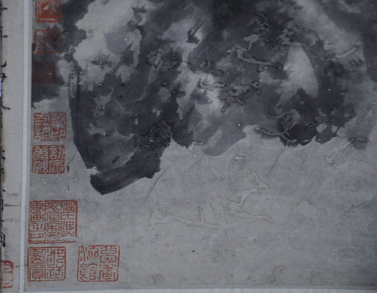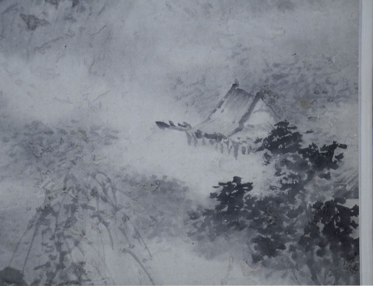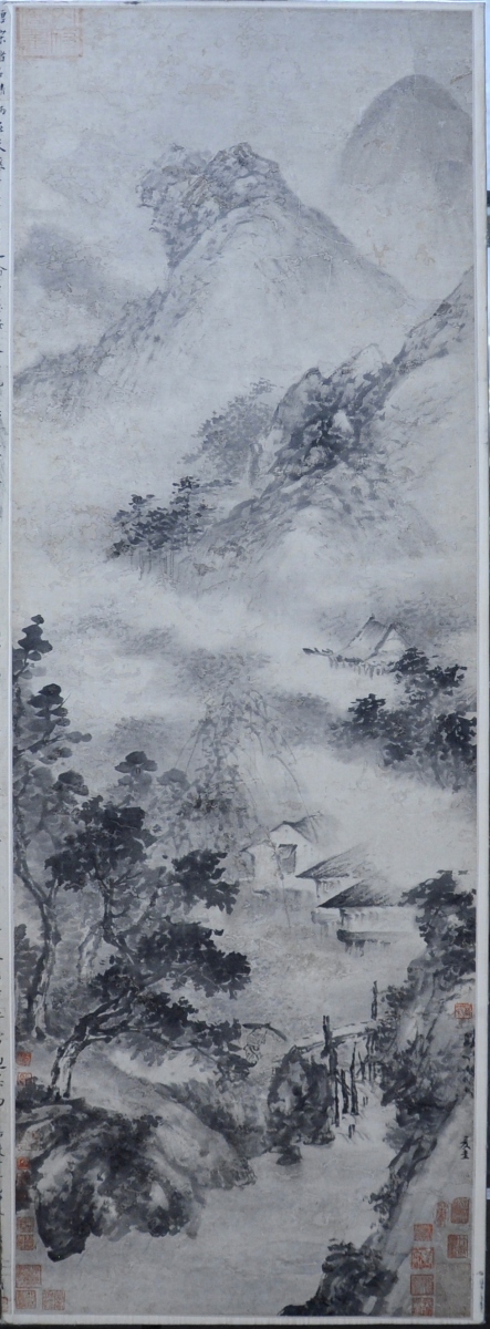 École CHINOISE. Paysage de montagne, cascade et pavillons. Signature apocryphe du peintre des Song du Sud Xia Gui.