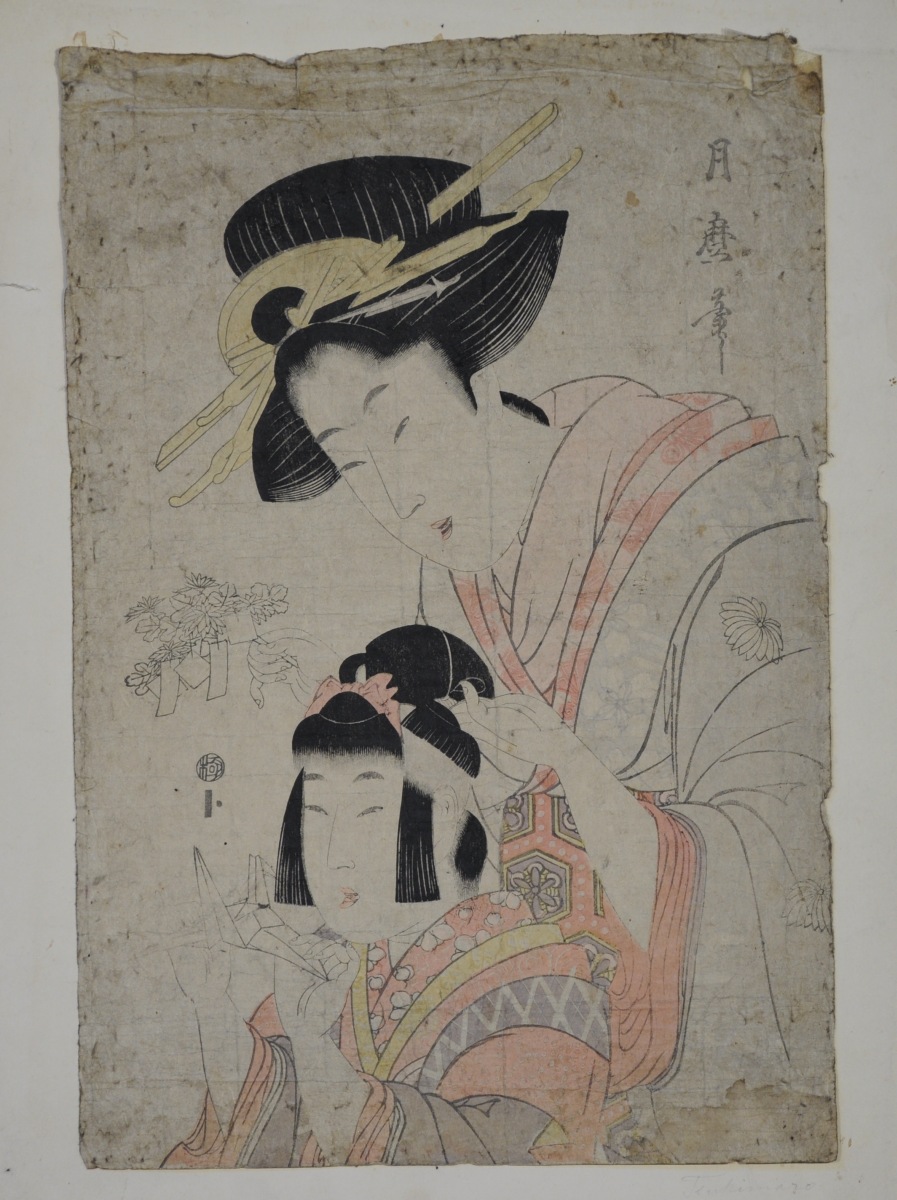 Oban tate-e, okubi-e d'une jeune femme ajustant la coiffe d'une petite fille qui regarde un origami en forme de grue.