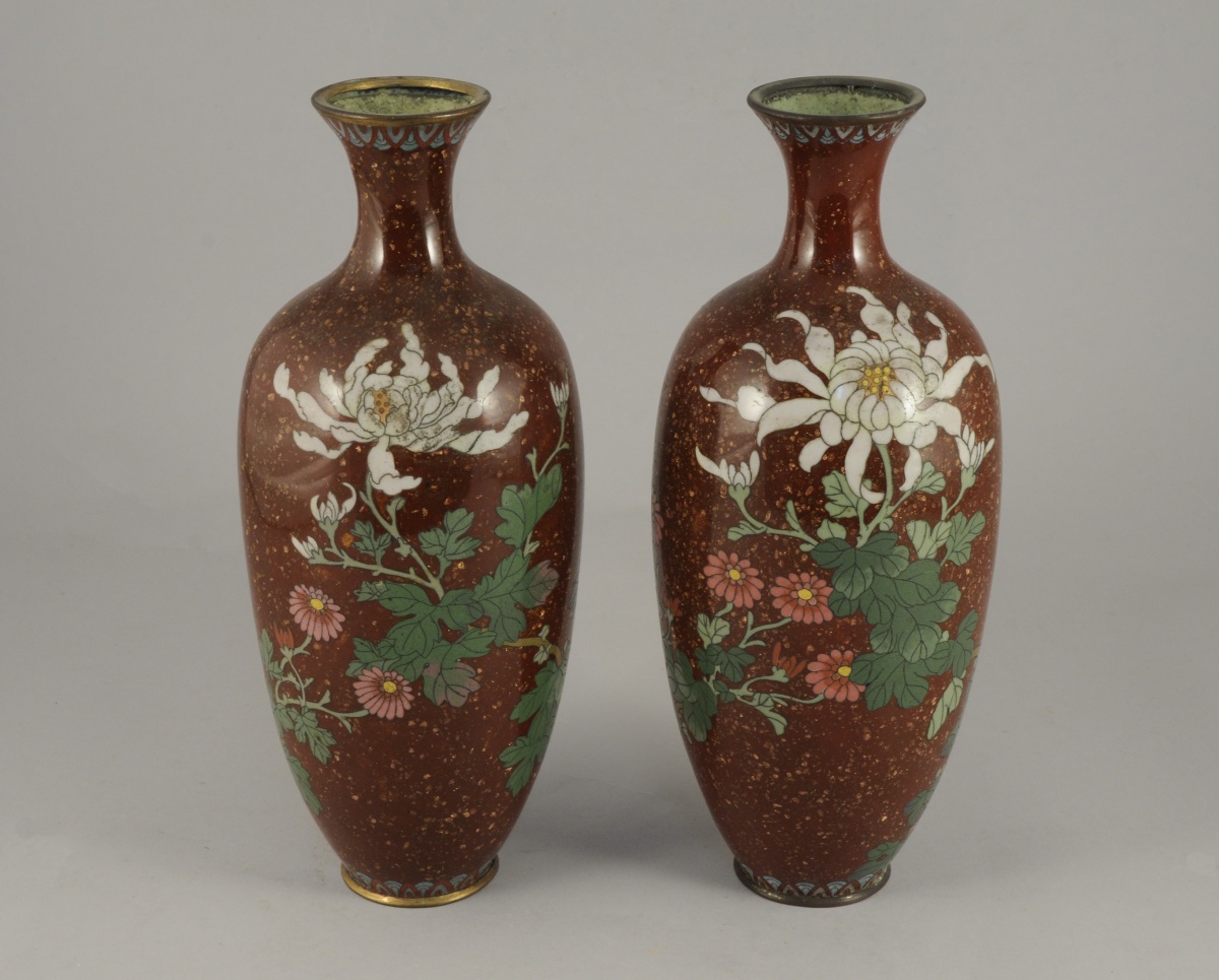 Paire de VASES en cuivre et émaux cloisonnés, à décor de pivoines blanches et de paquerettes roses sur fond pailleté. Intérieurs et fonds émaillés vert.