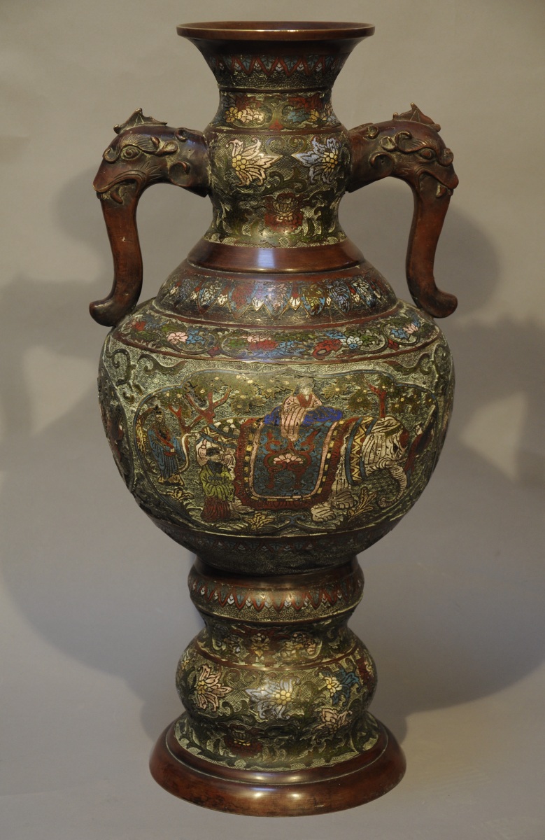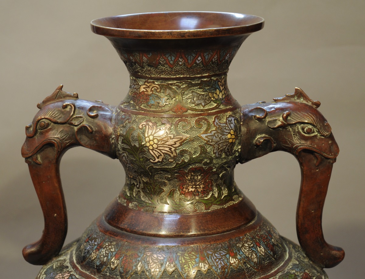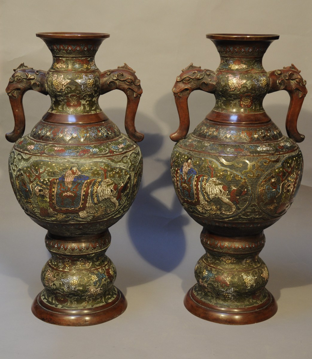 PAIRE DE VASES balustre à col évasé en bronze et émaux cloisonnés polychromes à décor de personnages à dos d'éléphant dans des réserves le long de la panse et de fleurs de lotus sur fond losangé sur le corps. Les anses en forme de tête de chimère, le tout reposant sur un piédouche à double renflement.
