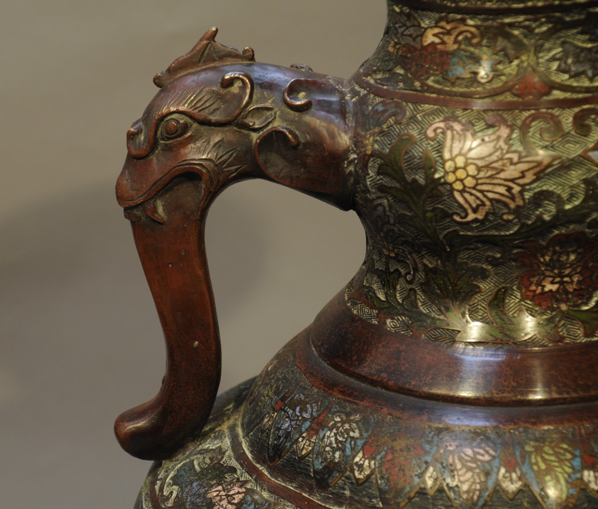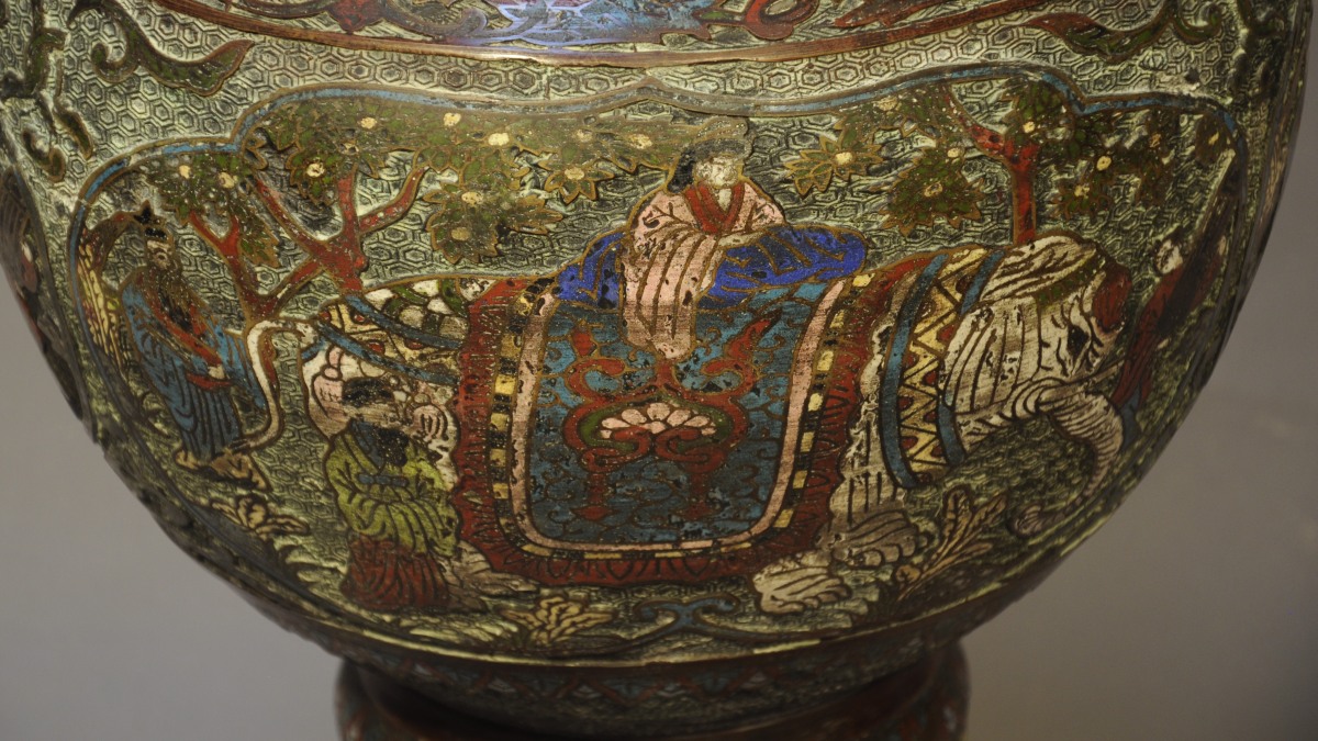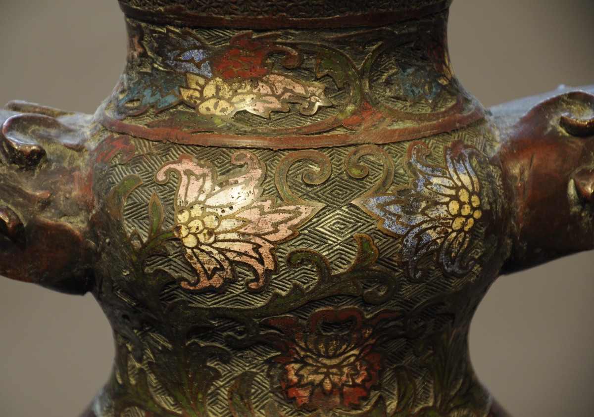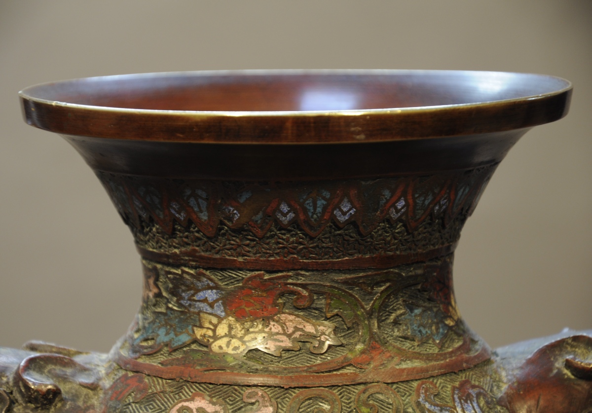 PAIRE DE VASES balustre à col évasé en bronze et émaux cloisonnés polychromes à décor de personnages à dos d'éléphant dans des réserves le long de la panse et de fleurs de lotus sur fond losangé sur le corps. Les anses en forme de tête de chimère, le tout reposant sur un piédouche à double renflement.