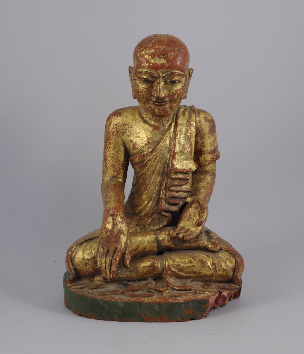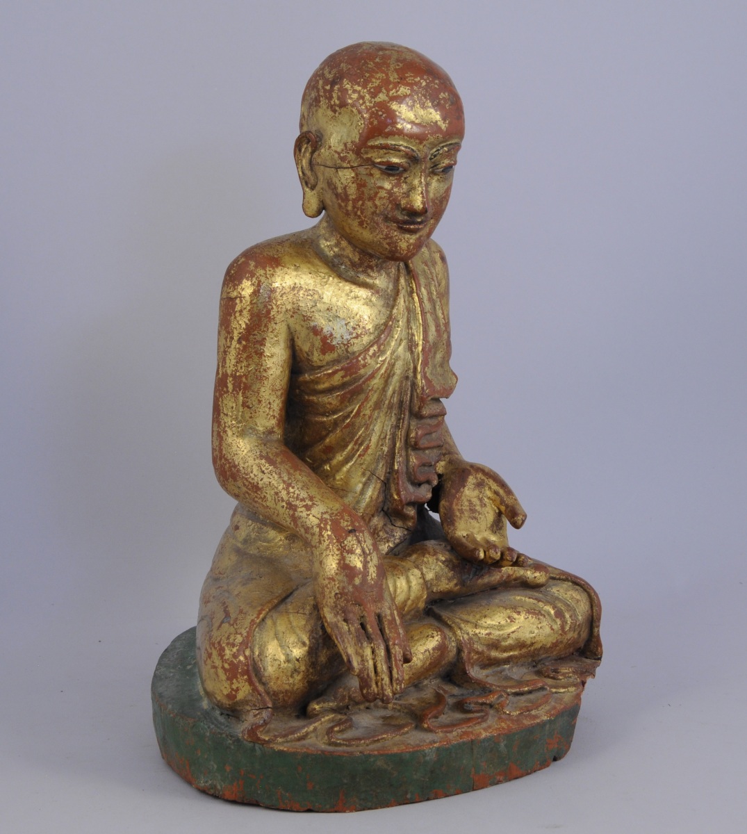 BOUDDHA en bois sculpté et doré assis en tailleur, une main à plat, l'autre en position d'offrande.