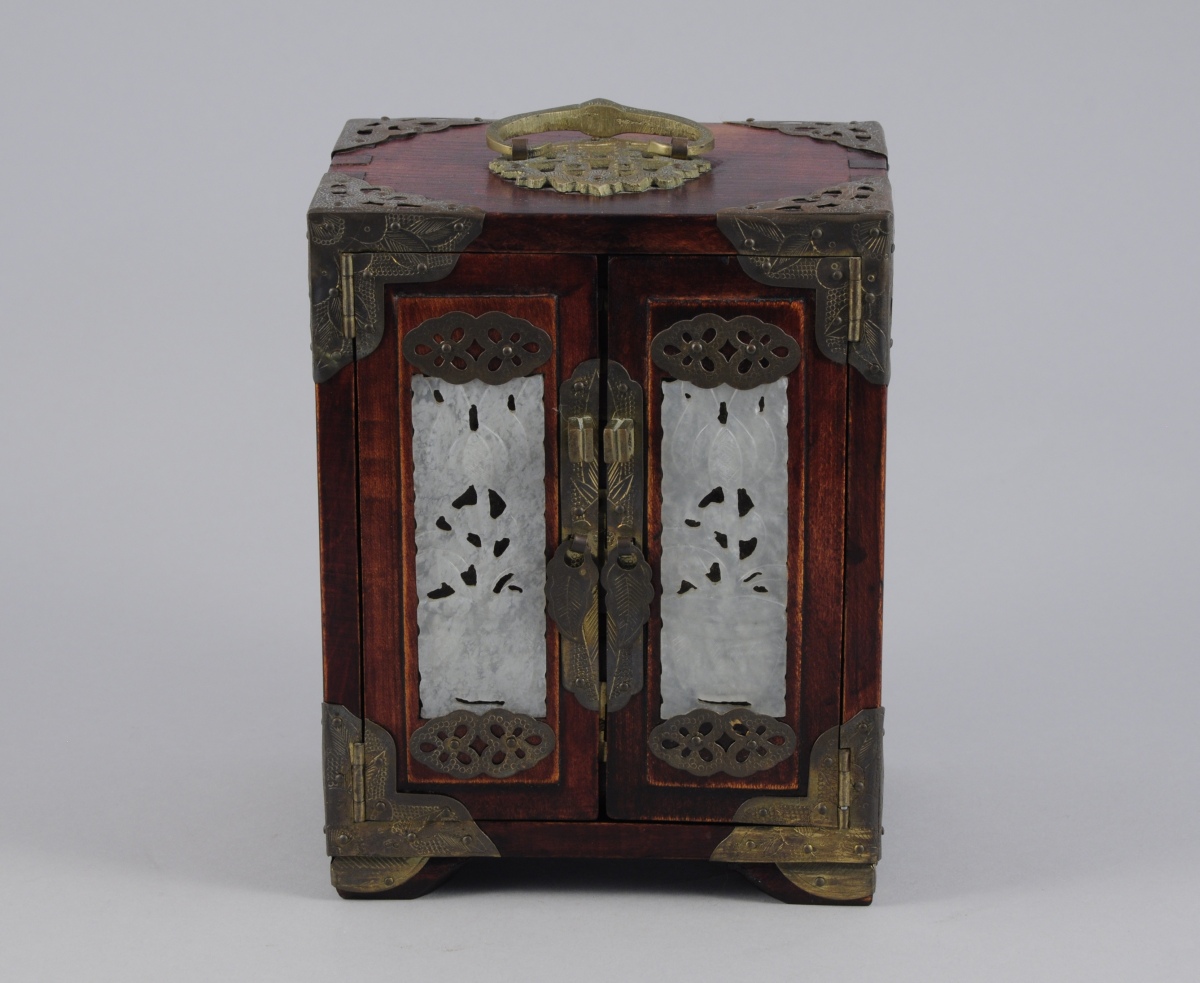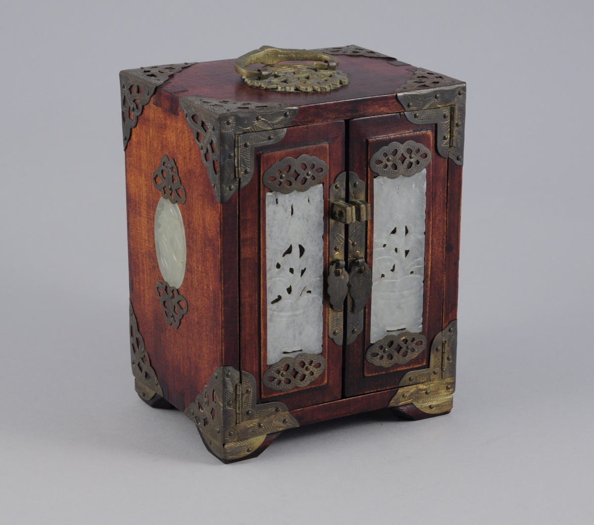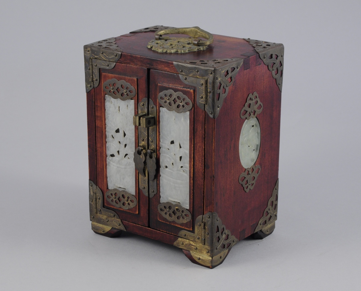COFFRET-CABINET de forme rectangulaire en bois teinté. Il ouvre en façade par deux vantaux découvrant trois tiroirs. Les vantaux et les côtés ornés d'une plaque en serpentine sculptée et ajourée d'une plante fleurie. enforts en laiton ouvragé.