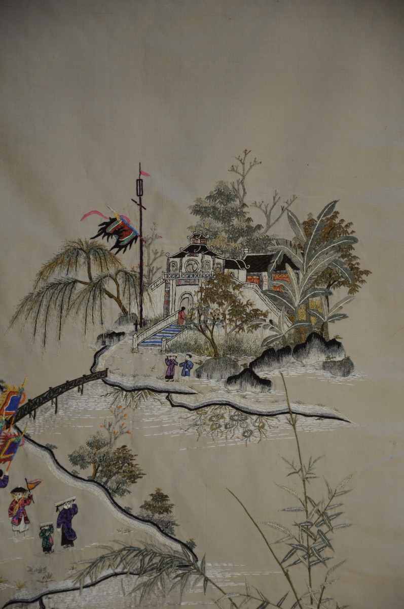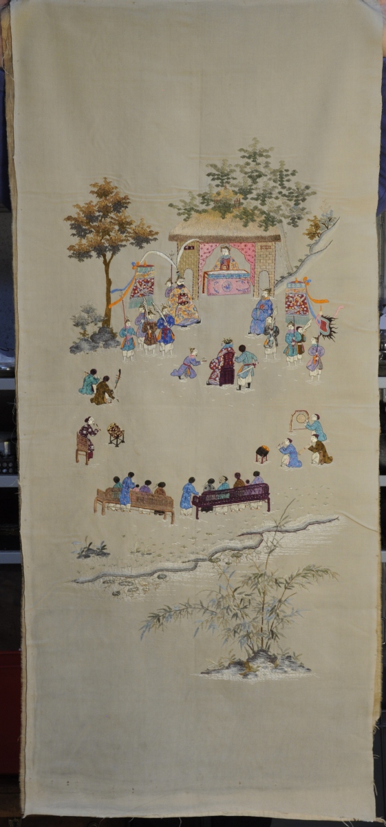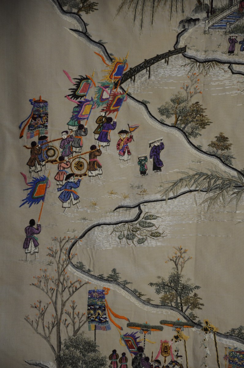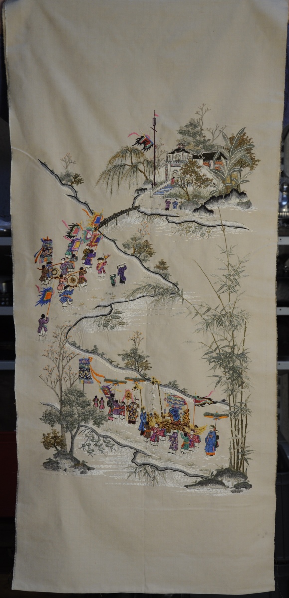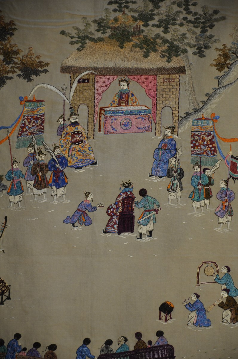 DEUX BRODERIES formant paire, tissu à fond beige brodé de scènes animées polychromes: procession et audience.