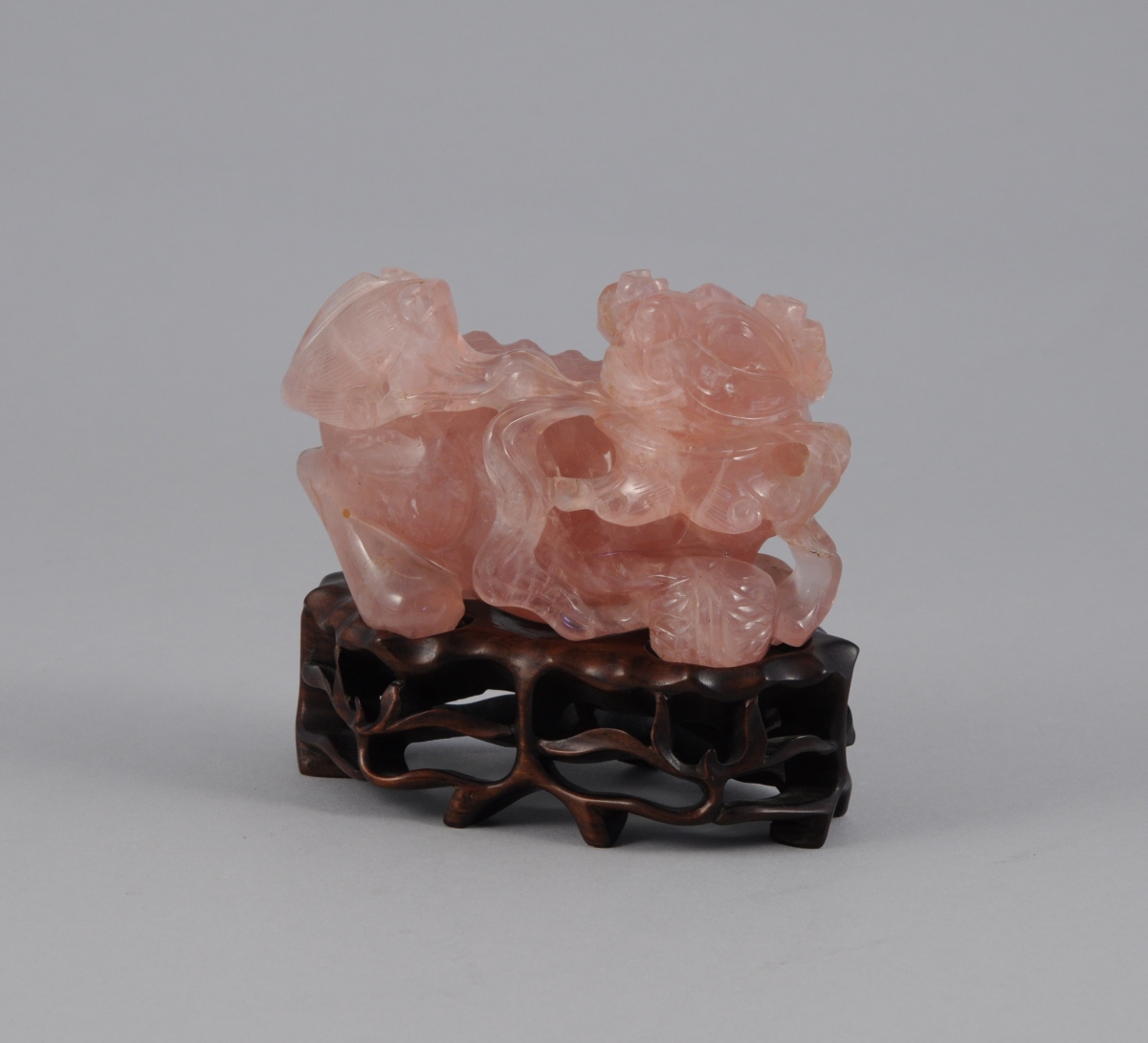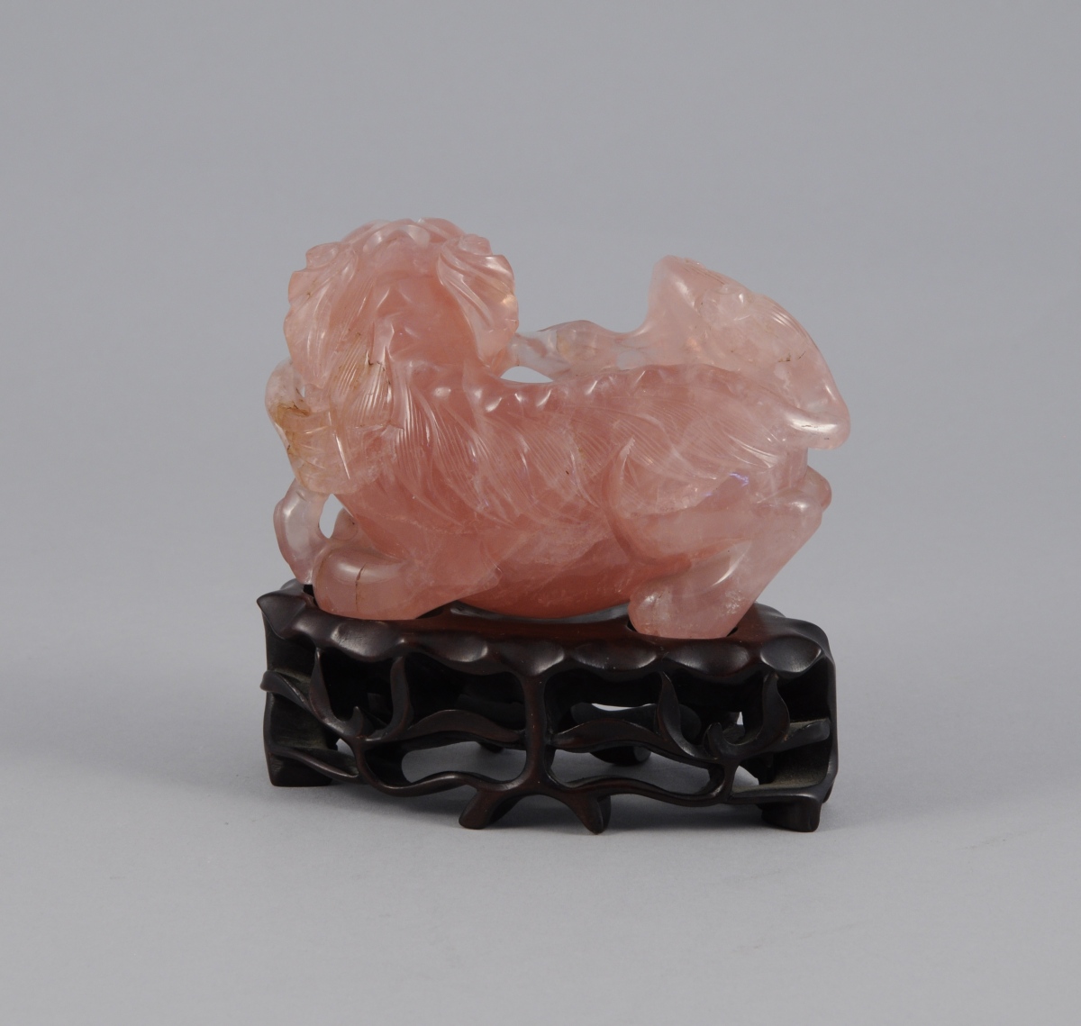CHIEN DE FÔ en quartz rose sculpté. Les pattes antérieures enserrant une boule.
