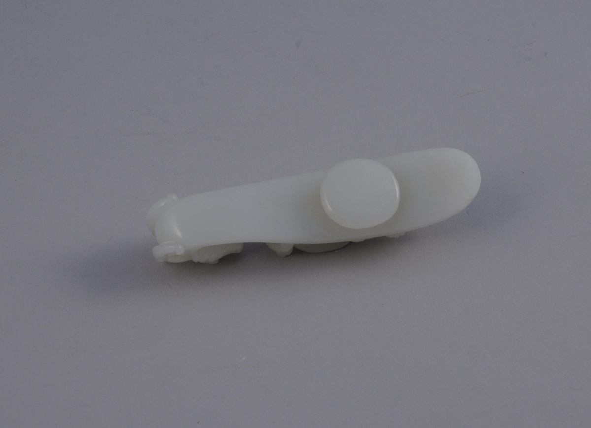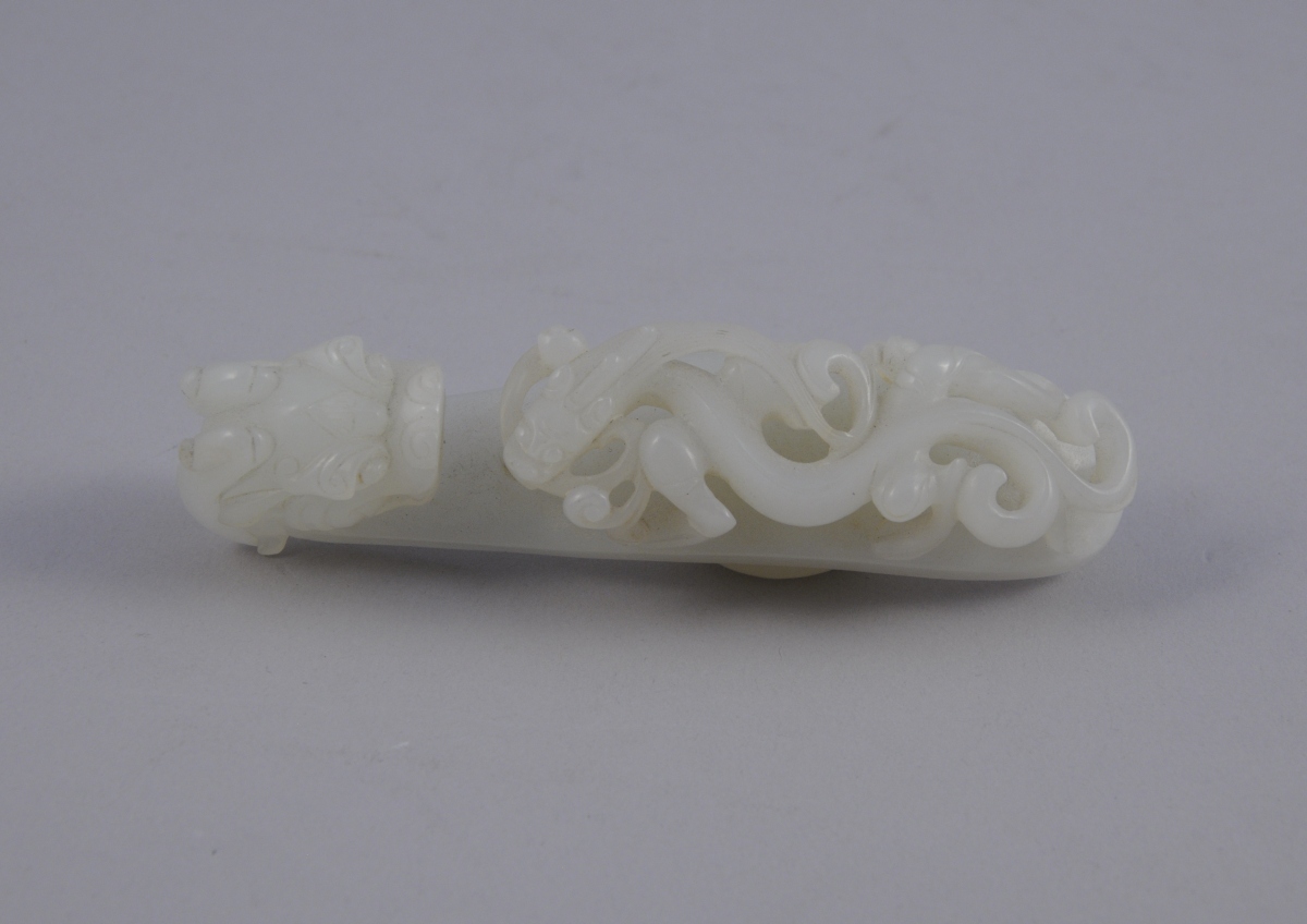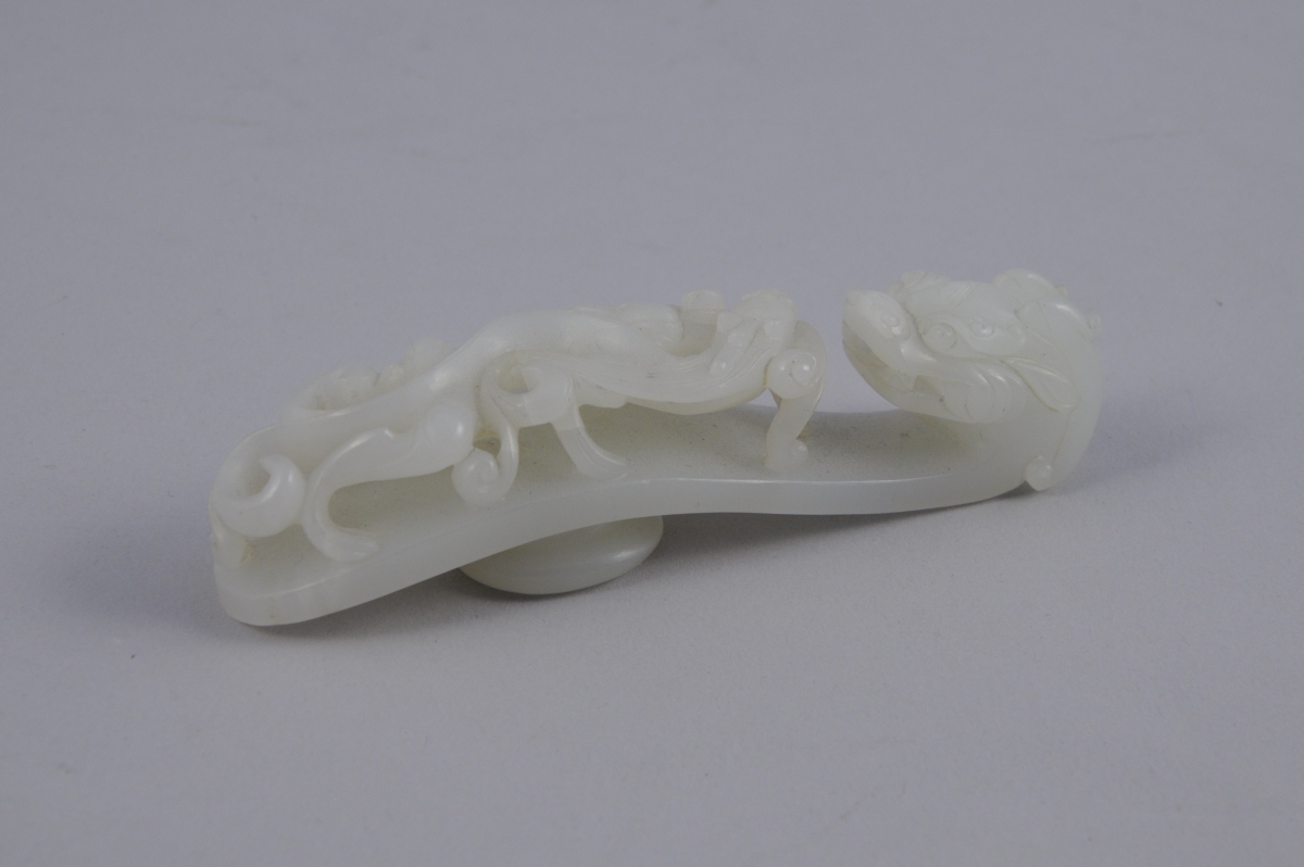FIBULE en néphrite blanche en forme de dragon à décor sculpté en relief et détaché d'un qilong. Chine, XVIII-XIXème.