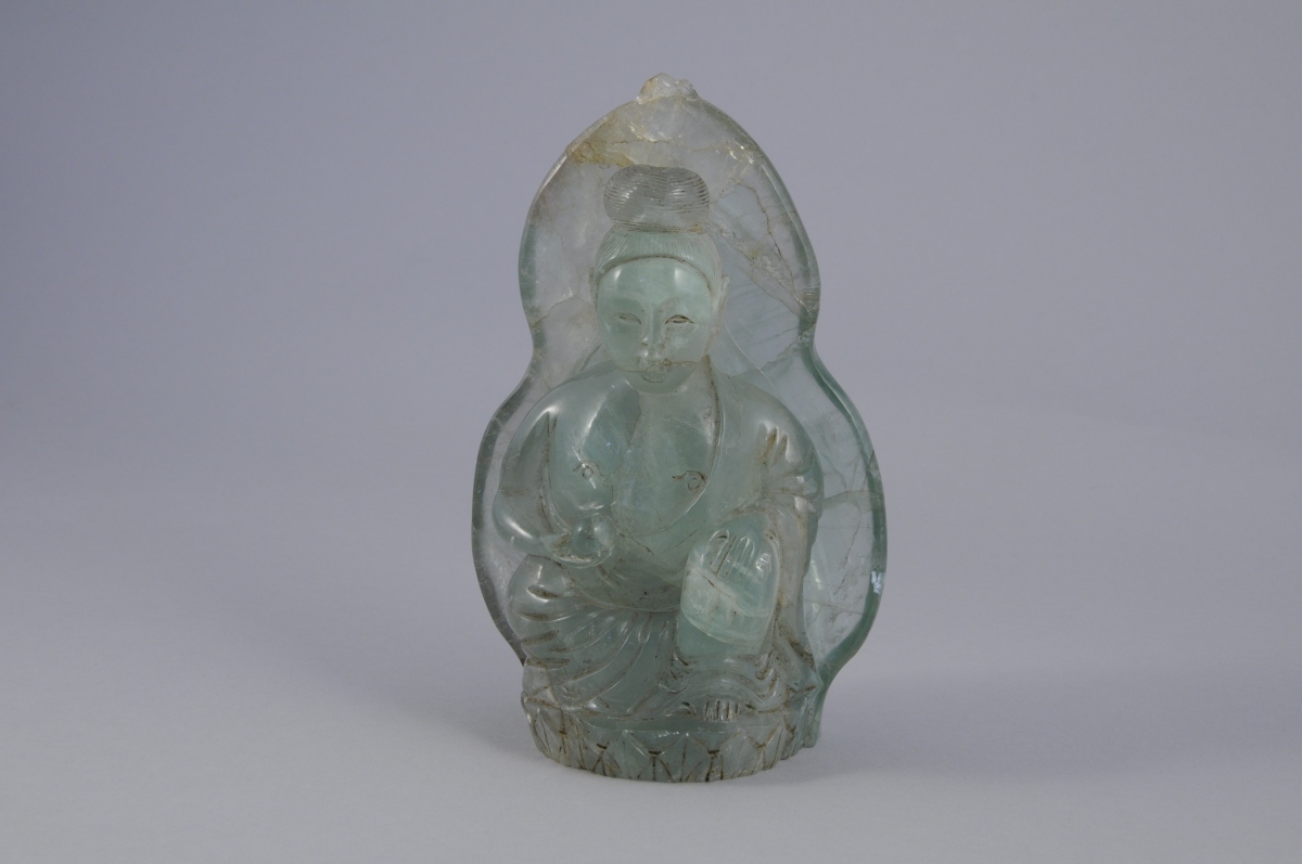 BOUDDHA en pierre dure verte (fluorine ?) sculptée en haut...