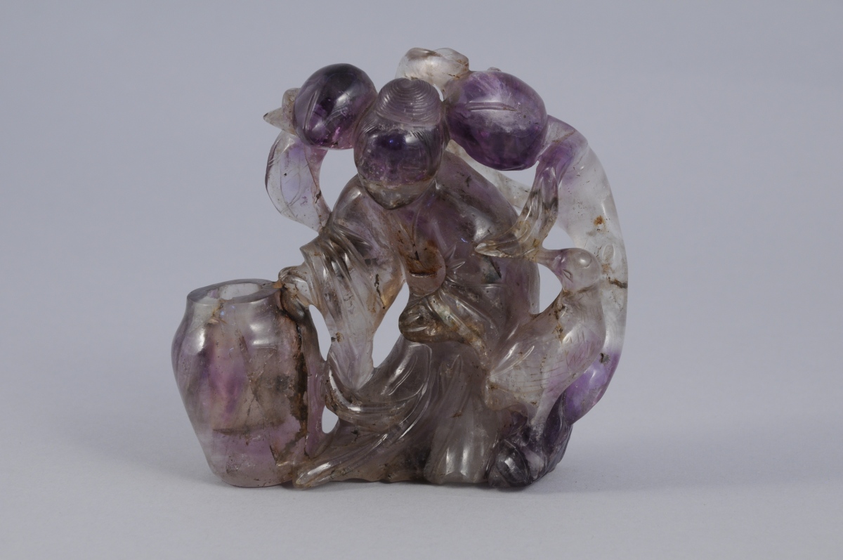 SUJET en fluorine améthysée sculpté d'une femme aux côtés d'un échassier sous un pêché. Elle tient un vase de sa main droite.