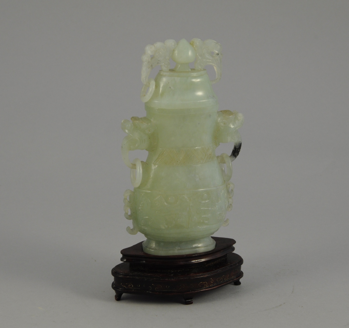 BRÛLE-PARFUM à panse applatie en pierre dure sculptée. Les anses à anneaux mobiles figurant une tête de dragon. La panse ornée d'un masque de taotie.