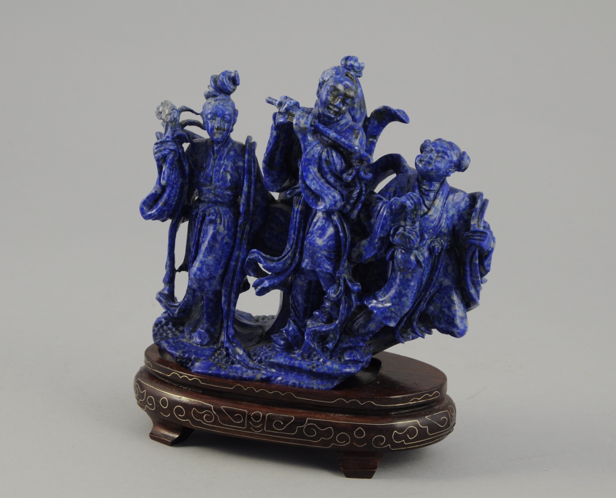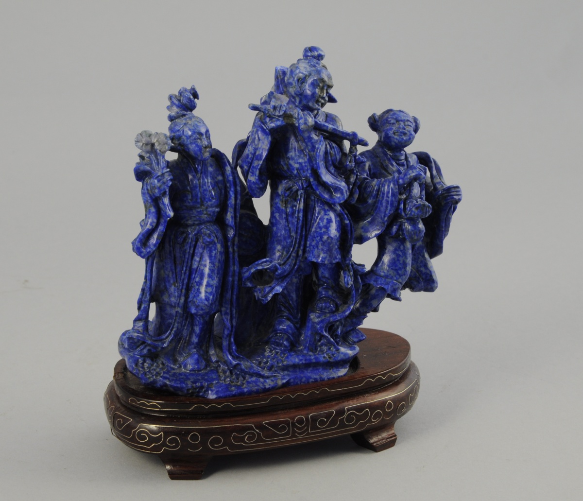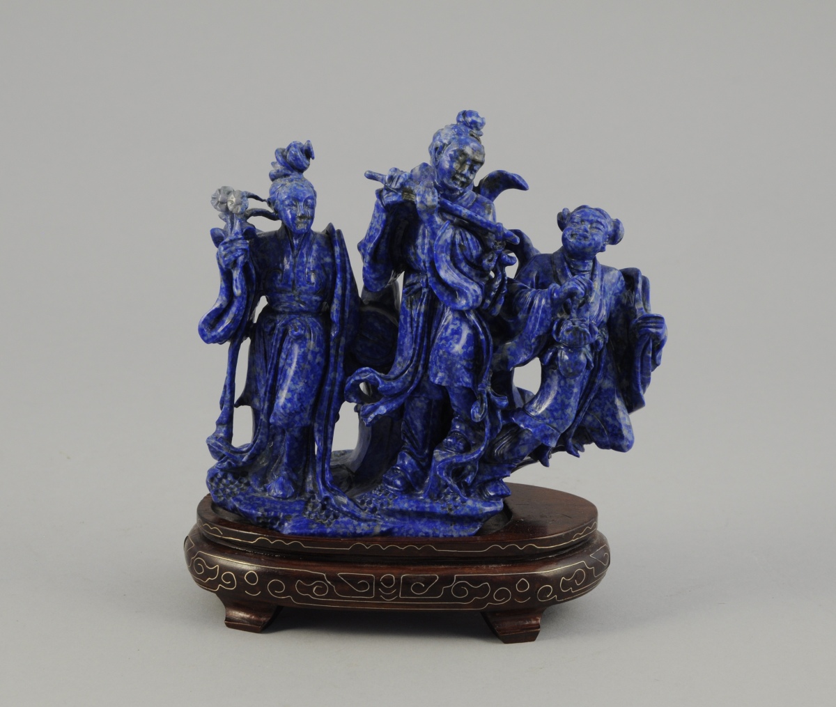 GROUPE en lapis -lazuli sculpté figurant trois personnages. Le premier tient une tige fleurie, le deuxième joue de la flûte et le dernier porte une fleur de lotus.