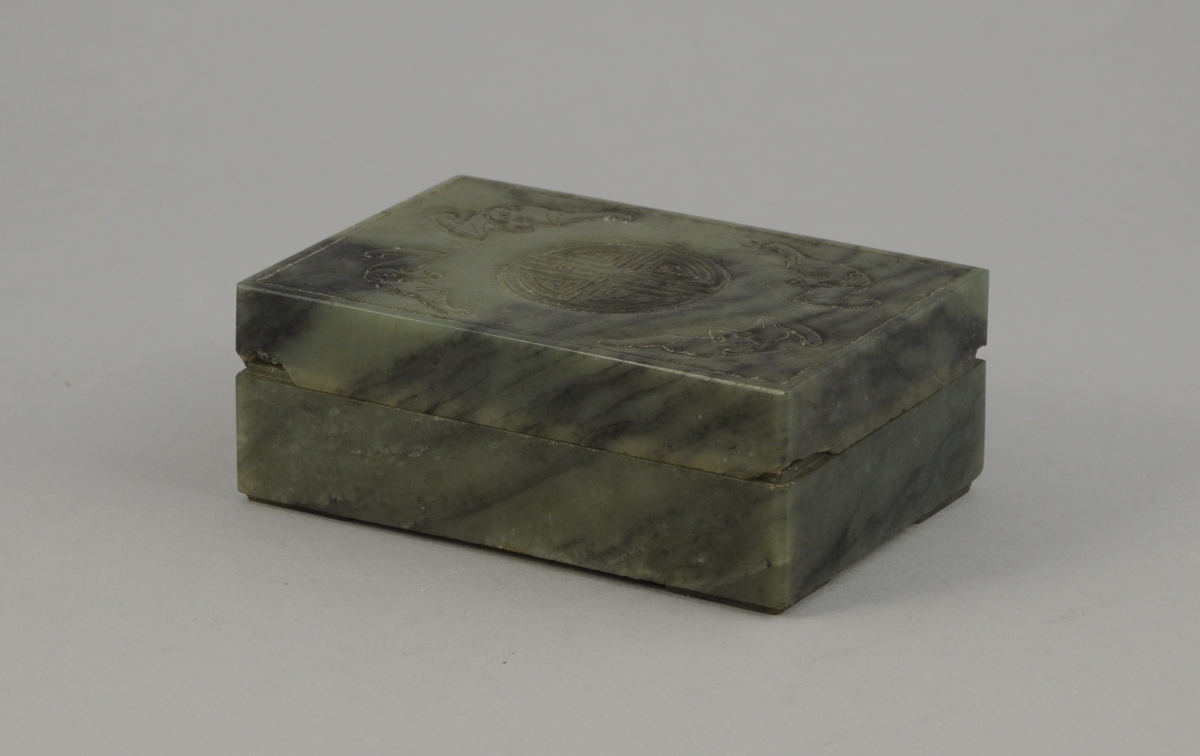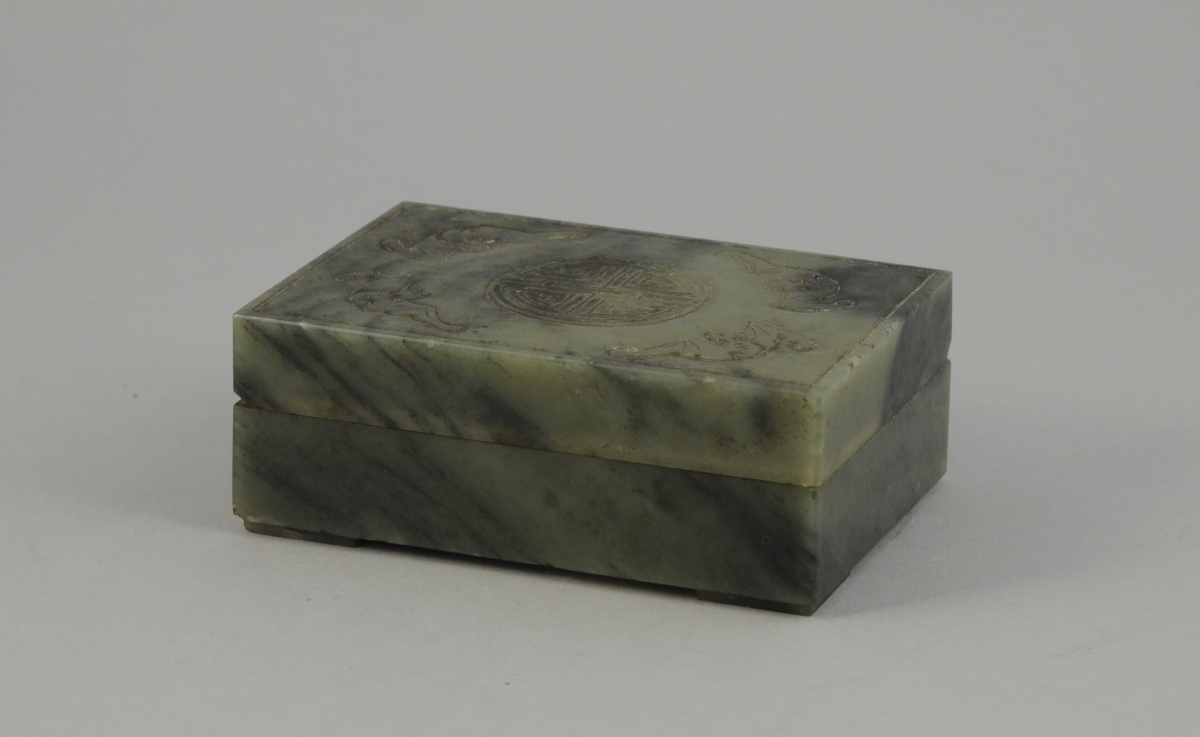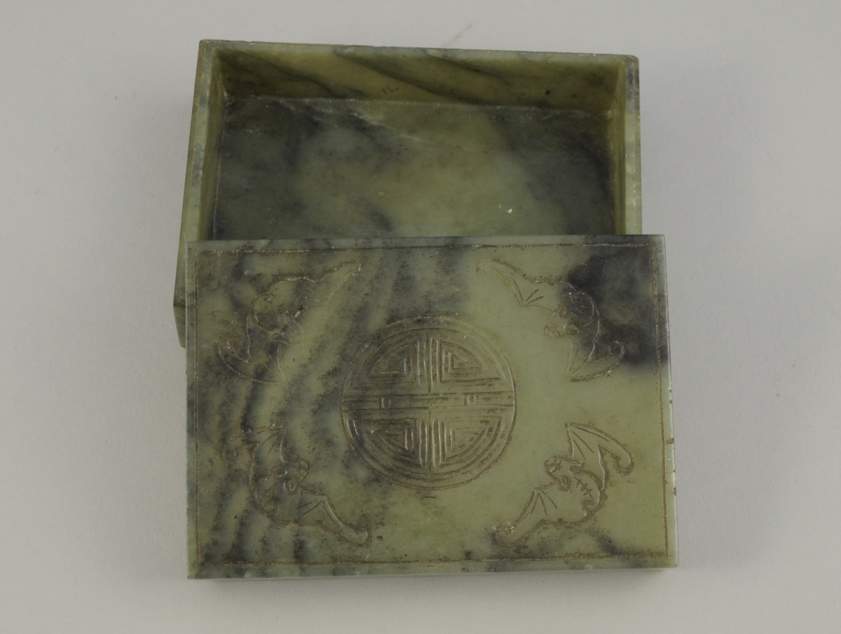 BOÎTE de forme rectangulaire en pierre dure. Le couvercle sculpté d'un idéogramme et de quatre chauves-souris.