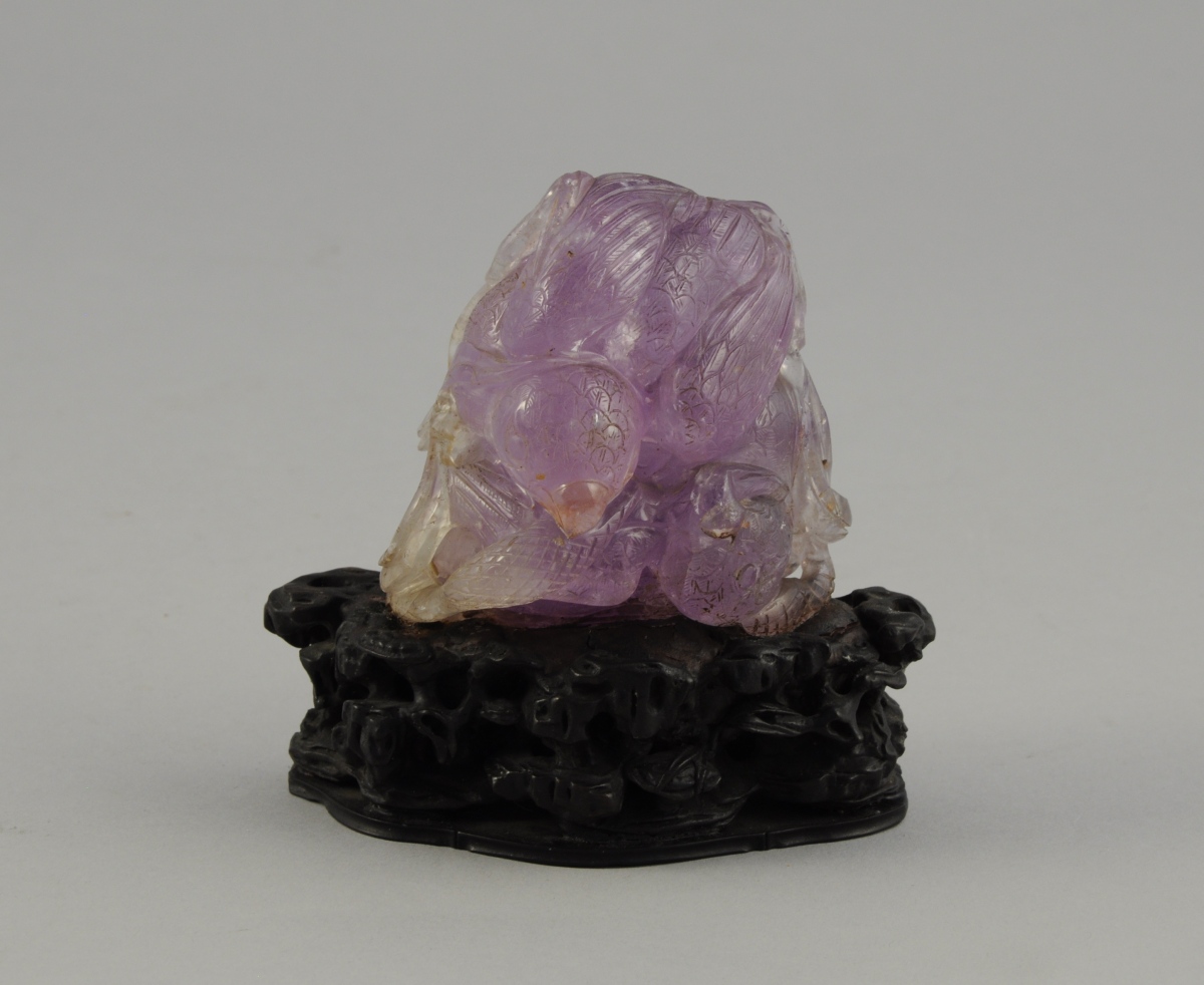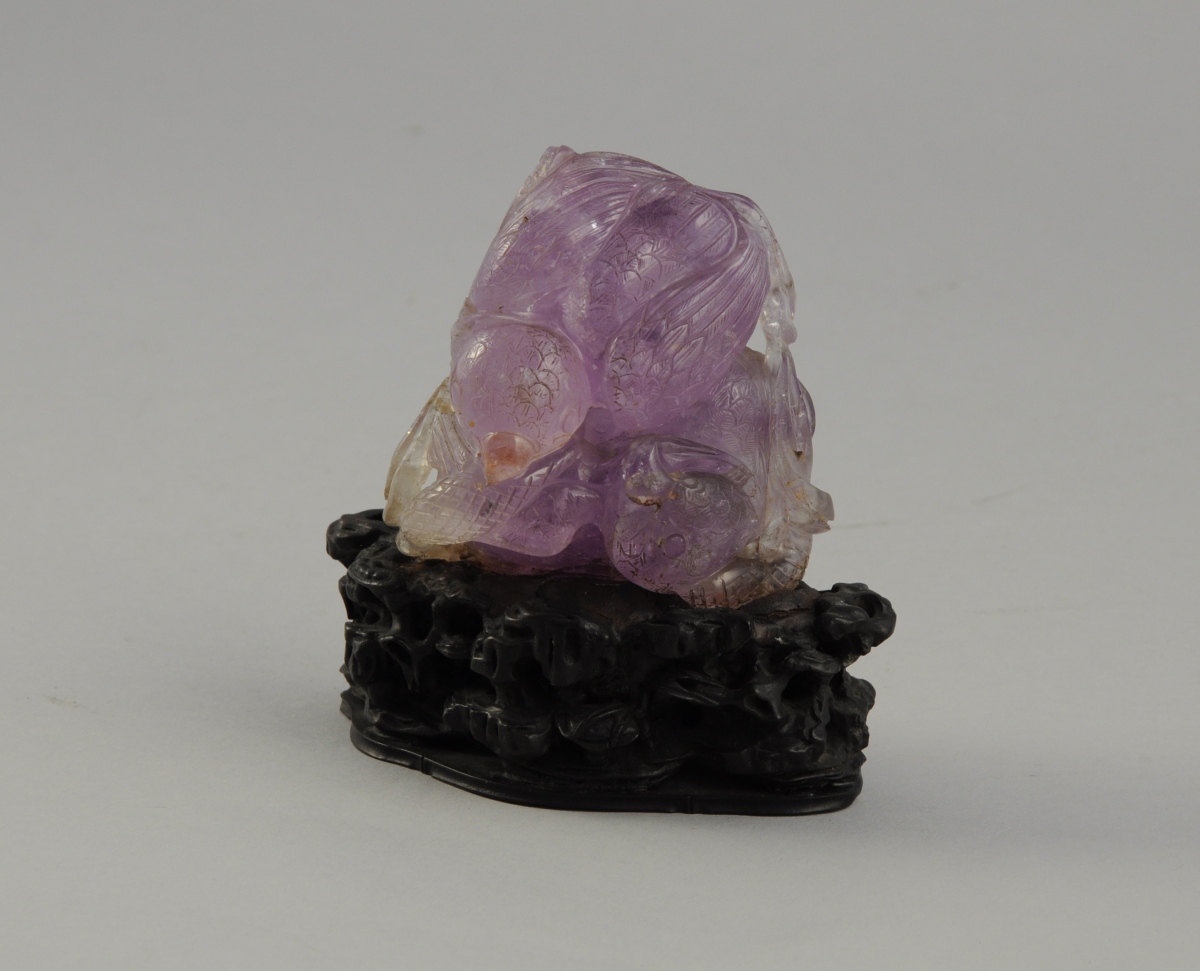 STATUETTE en améthyste (fluorite?) figurant deux moineaux.