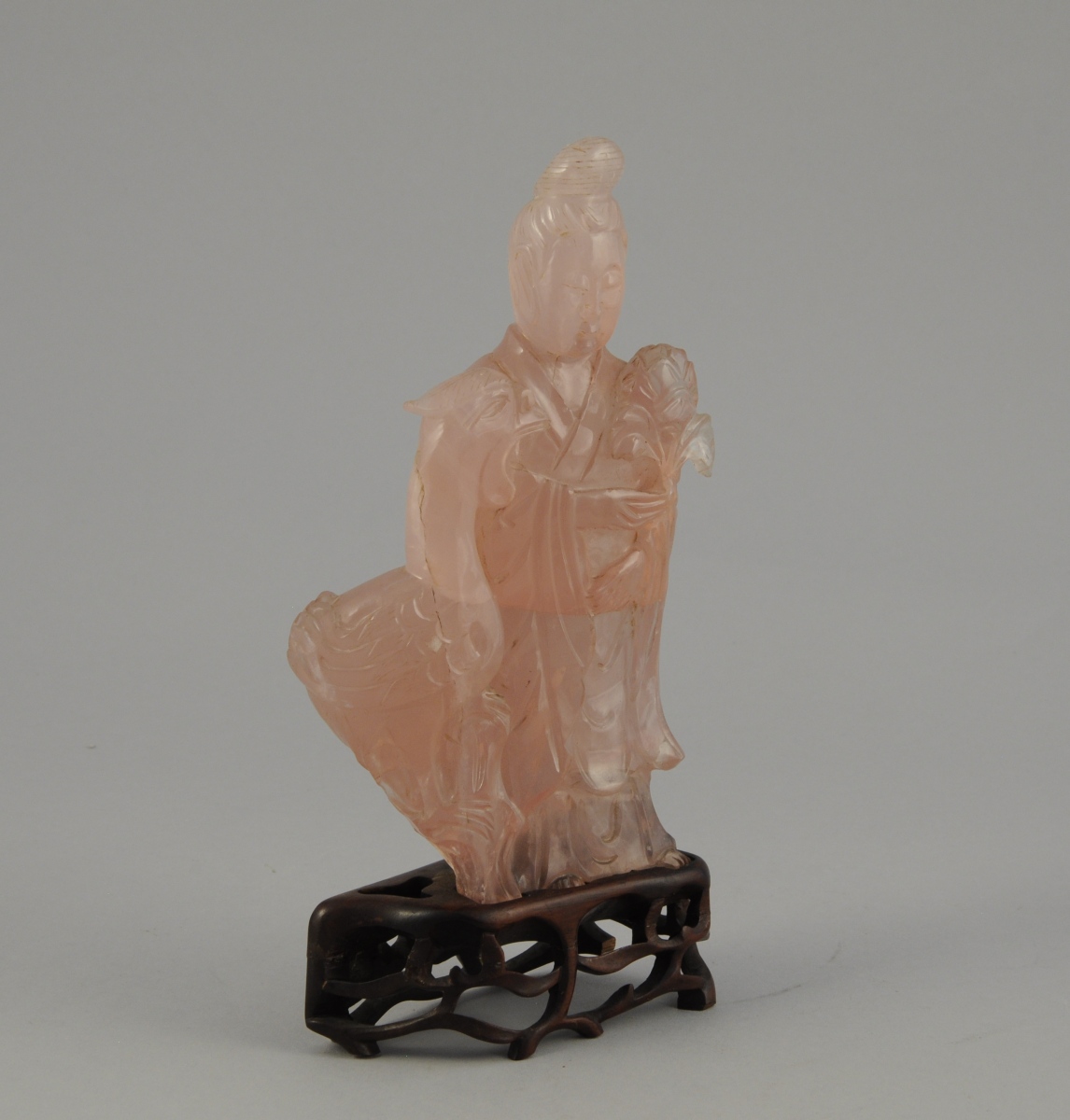STATUETTE en quartz rose sculpté figurant un homme tenant une fleur de lotus. À sa droite se dresse un grand oiseau.
