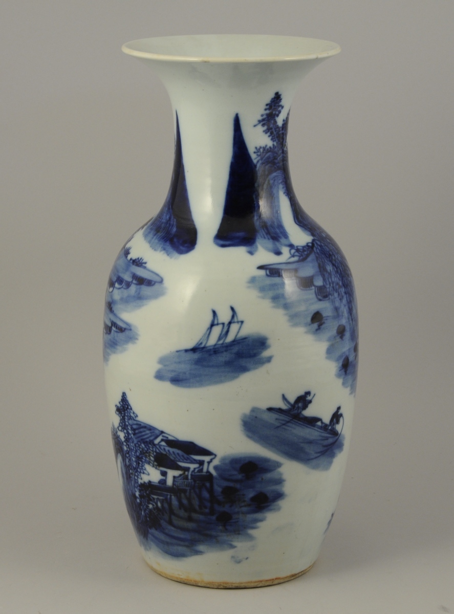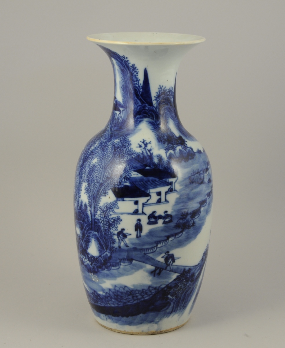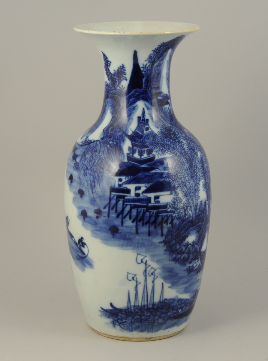 VASE en porcelaine. Décor de scènes lacustres en camaïeu bleu.