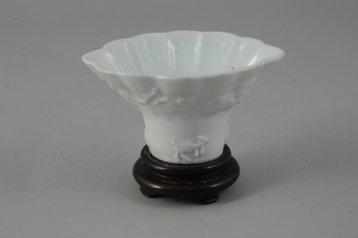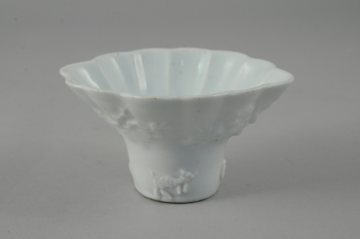 COUPE LIBATOIRE en forme de corne de rhinocéros en porcelaine émaillée blanc de Chine décoré en relief de cerf, dragon et prunier.