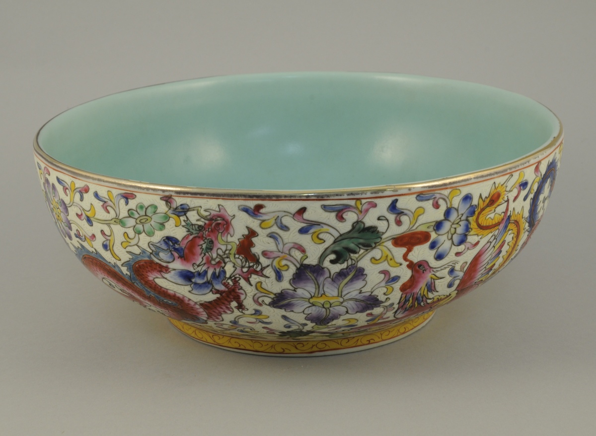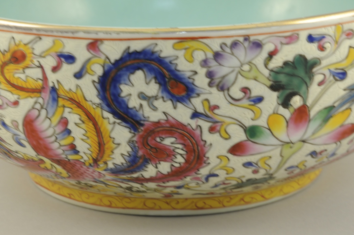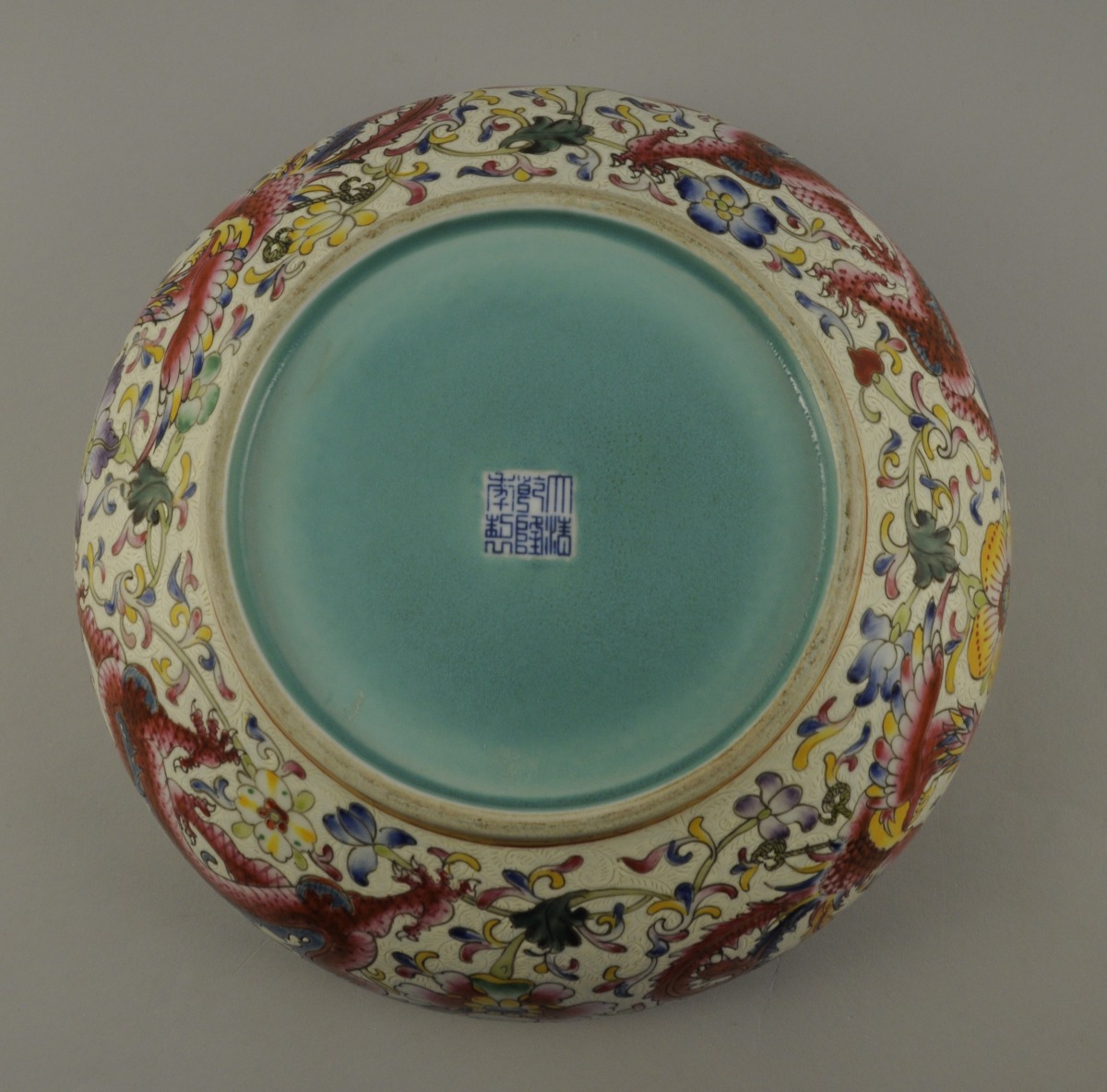VASQUE en porcelaine décorée en émaux polychromes dans le style de la famille rose de dragons et phénix entourant une fleur de prunier. Marque apocryphe de Qianlong.